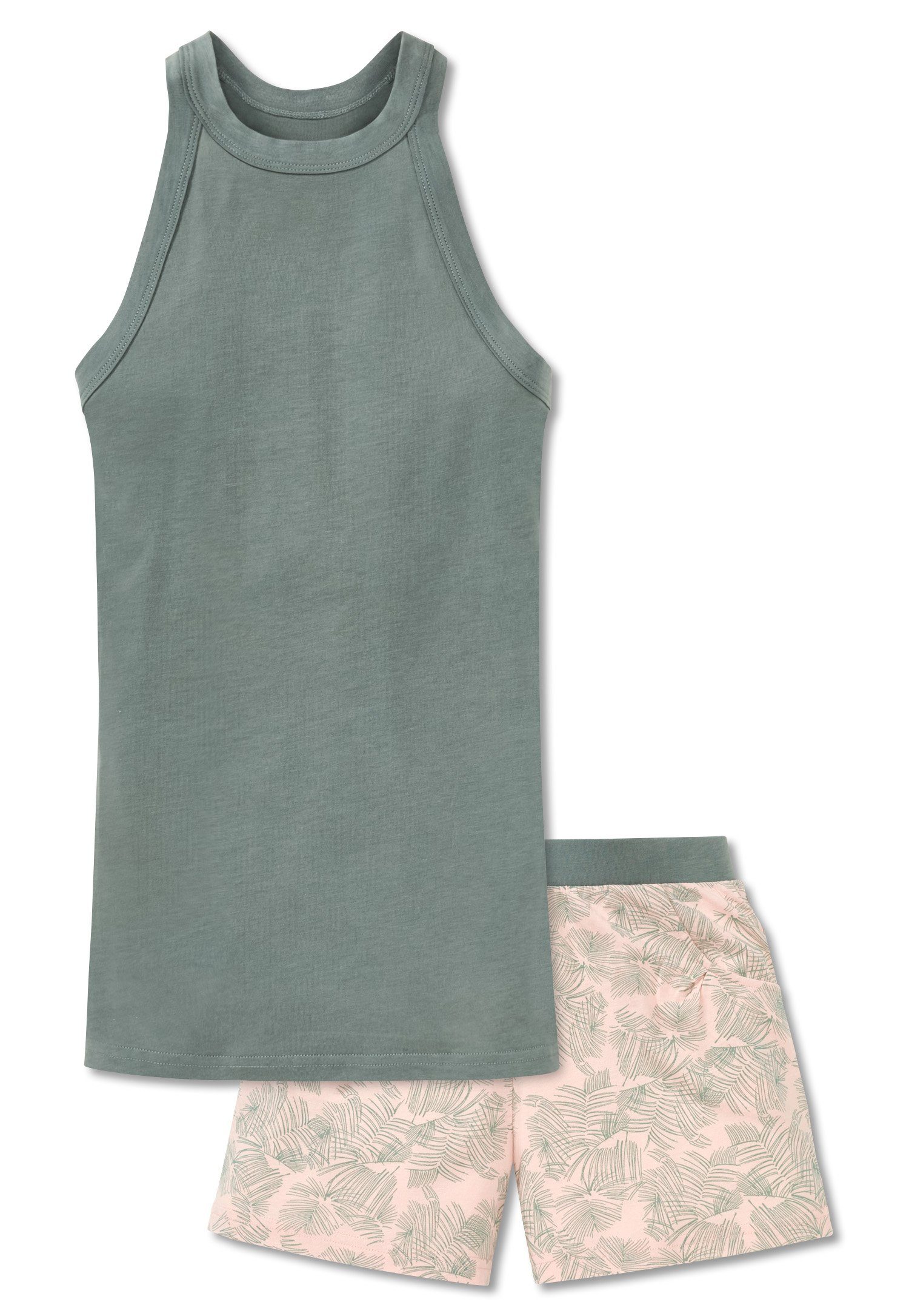 In diesem kurzen Mädchenschlafanzug kommt Summerfeeling auf! Das hoch geschnittene Trägershirt sieht in seinem Farn-Grün einfach klasse aus und leitet perfekt über in den gleichfarbenen Bund der Shorts. Hier zaubert ein grüner Palmenprint auf hellem Apricot-Sorbet Sommerlaune, die in leichtem Jersey aus Baumwolle und Modal wunderbar soft auf der Haut spürbar wird. Ein absolutes Dreamteam in bester SCHIESSER-Qualität. Farn-grünes Trägershirt mit hoch geschnittenem Halsrand, Shorts mit farn-grünem, breitem Bund, farn-grünes Palmen-Muster auf apricot-sorbet-farbenem Fond, abgerundete Seitentaschen mit hübschen Zierfalten, in wunderbar weicher Single-Jersey-Qualität.