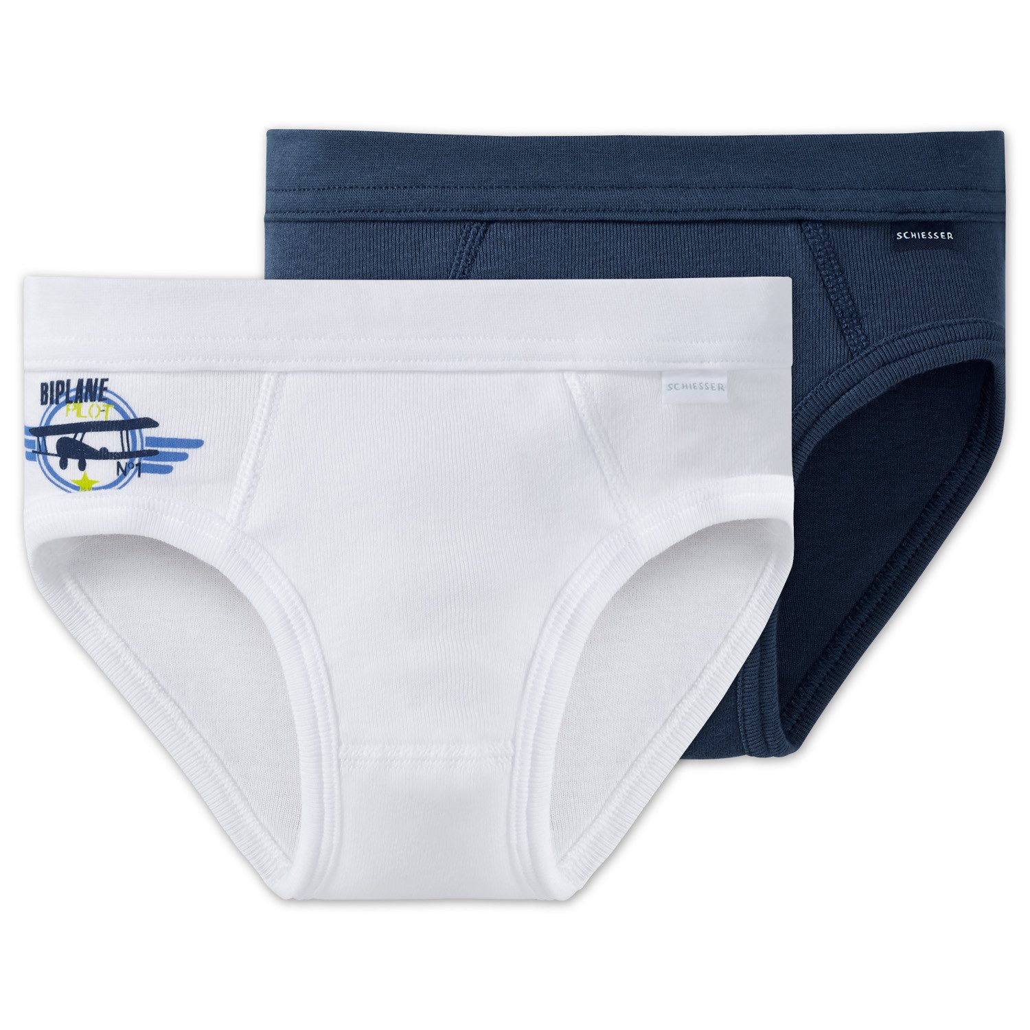 Diese beiden Jungen-Sportslips sind genau das Richtige für kleine Flugzeug-Fans! Tolle Doppeldecker-Motive schenken dem dunkelblauen und weißen Slip spannende Details und werden von Schriftzug ""BIPLANE PILOT No1" auf dem weißen Modell prima begleitet! In weichem Feinripp aus 100% Baumwolle und mit dem soften Bund ist für viel Bequemlichkeit gesorgt und Ihr kleiner Wirbelwind kann in bester SCHIESSER-Qualität die Welt unsicher machen.