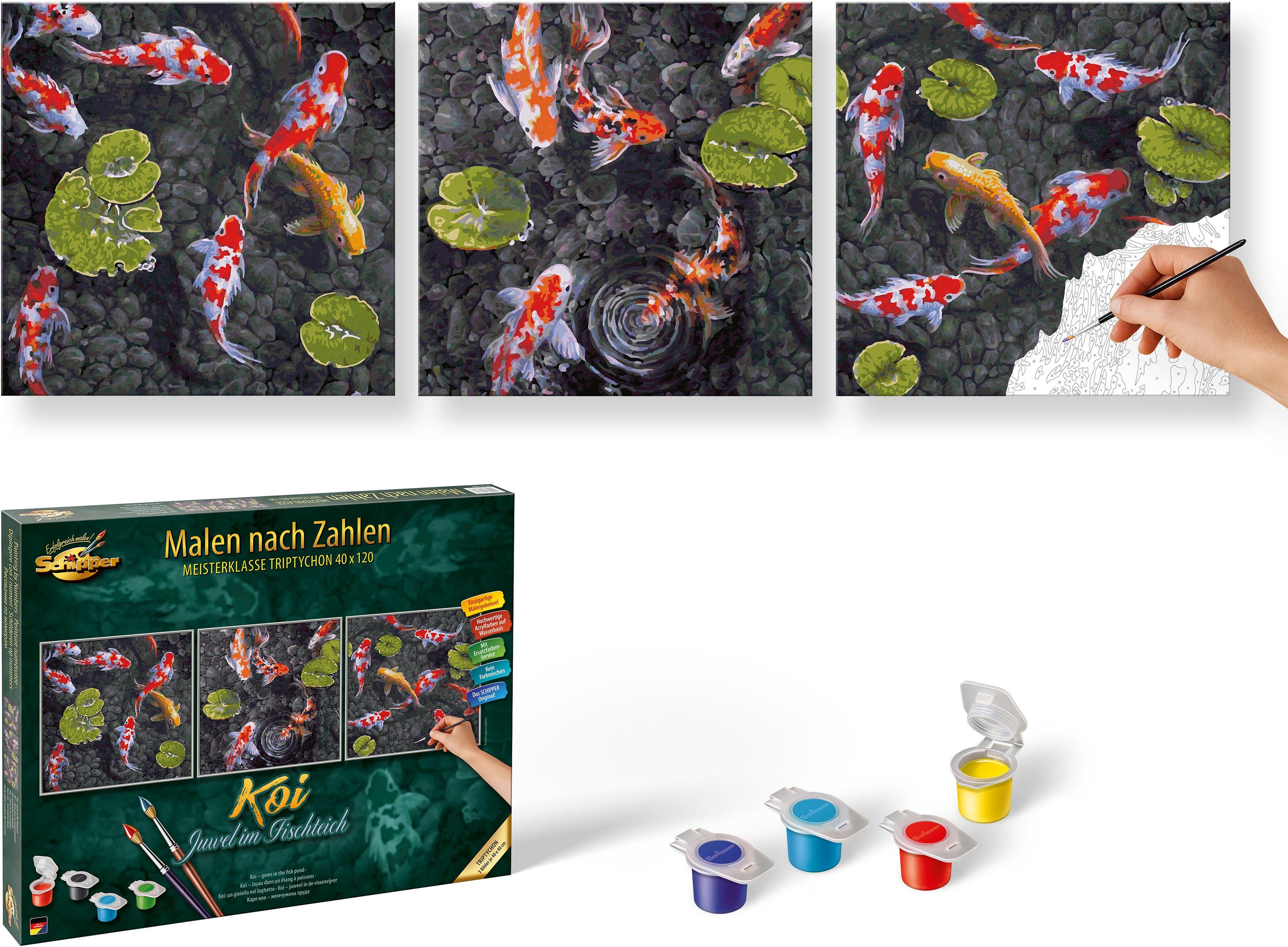 Lieferumfang | Acrylfarben auf Wasserbasis Anleitung Kontrollblatt Maltafeln Pinsel |
