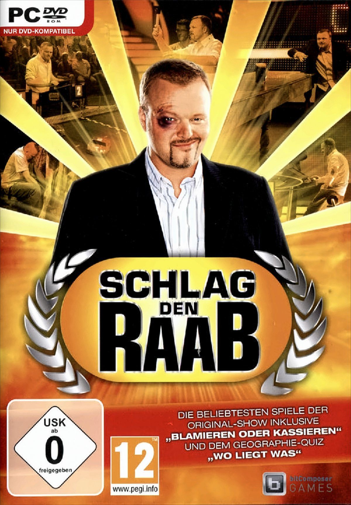 Spielbeschreibung | Schlag den Raab oder die Freunde!Treten Sie gegen Multitalent Stefan Raab an und versuchen Sie, dem ehrgeizigen Moderator zu zeigen, wer in Sachen Geschicklichkeit, Wissen und Action mehr auf dem Kasten hat. Stellen Sie im beliebten Quiz "Blamieren oder Kassieren" Ihr Allgemeinwissen unter Beweis und nutzen Sie ihre Geographie-Kenntnisse bei "Wo liegt was?". Beim "Pömpel-Spiel" geht's ordentlich zur Sache und beim "Kuh melken" können Sie Stefan zeigen, wer im Stall die Nase vorn hat. Das gilt natürlich nicht nur für Sie, sondern auch für Ihre Freunde, denn Schlag den Raab ist auch im Party-Modus ein Spaßgarant. Holen Sie sich den Jackpot!Features:* Einzigartige Kombination aus Quiz- und Actionspielen* Humorvolle Umsetzung der TV-Show mit liebevoll gestalteten Karikaturen von Elton und Raab* Duell-Modus: Treten Sie gegen Stefan Raab in der Sendung an und holen Sie sich den Jackpot* Party-Modus: Bis zu 4 Spieler können hier gegeneinander antreten* Original-Regelwerk der Sendung* Authentische TV-Atmosphäre mit der Originalstimme von Elton* 19 Minispiele aus den Bereichen Geschicklichkeit, Wissen und Action* Spezielles Bonussystem garantiert langfristigen Spielspaß durch Freischalten neuer Minispiele* Ein Katalog von mehr als 2.000 Fragen sorgt für ständig neue Herausforderungen.* Nahezu unendlich viele generierte Fragen bzw. Aufgaben in Spielen, wie „Kopfrechnen" oder „Mehr oder weniger"Features: Beliebter TV-Moderator21 SpieleZwei-Spieler-PartymodusSpezielles BonussystemSprache/Untertitel: DeutschHandbuch: Nein |