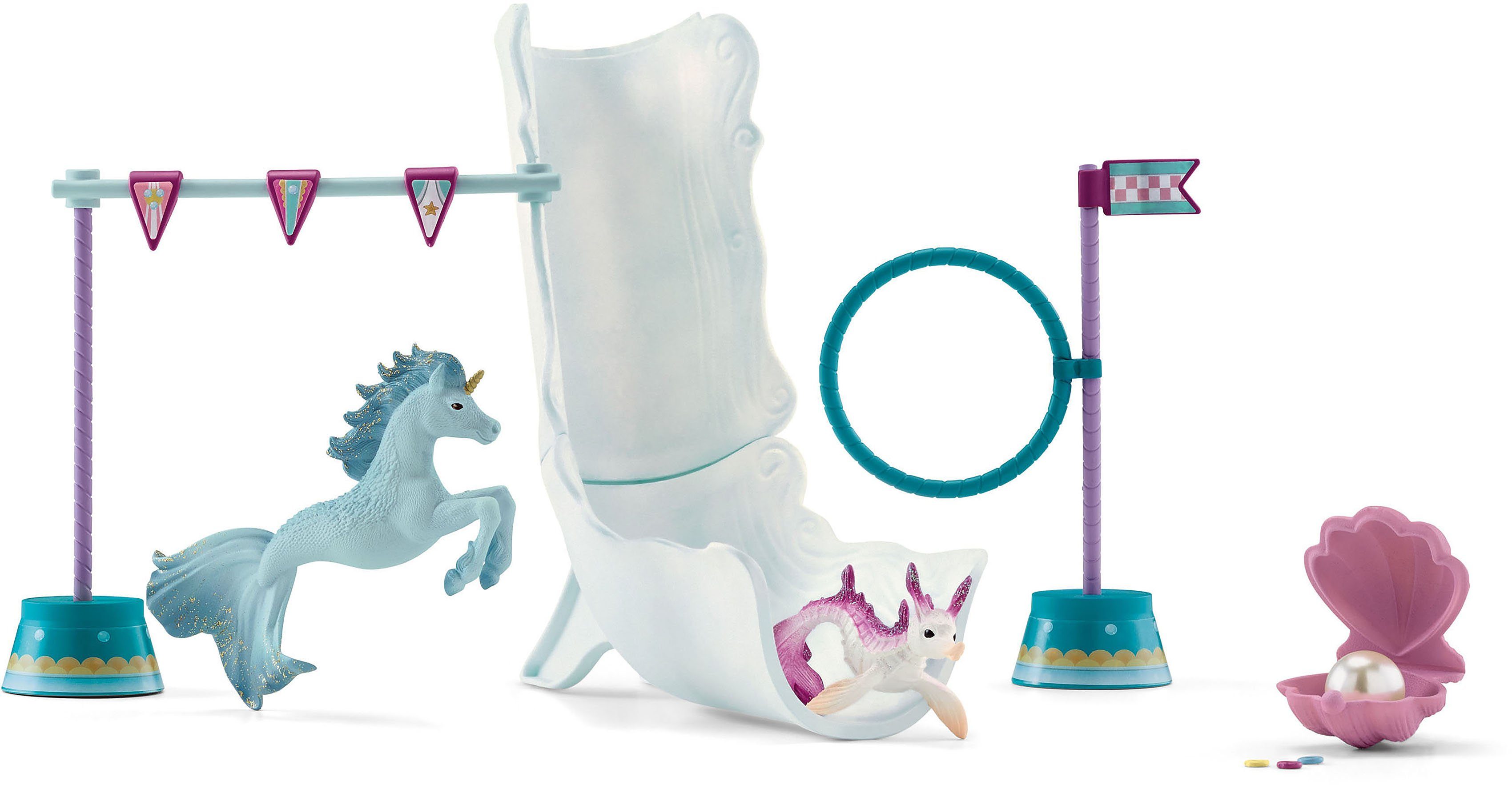 Ausstattung | 1x Hippocampus Fohlen, 1x Seepferdchen, Zubehör: 2x Podest, 1x Ring, 1x Doppel-C Clip, 1x Querstange, 3x Wimpel, 1x Fahne, 2x Spielring, Sticker, 1x Rutschen Teil, 1x Tunnel Teil, 1x Muscheltruhe, 1x Perlenmurmel |