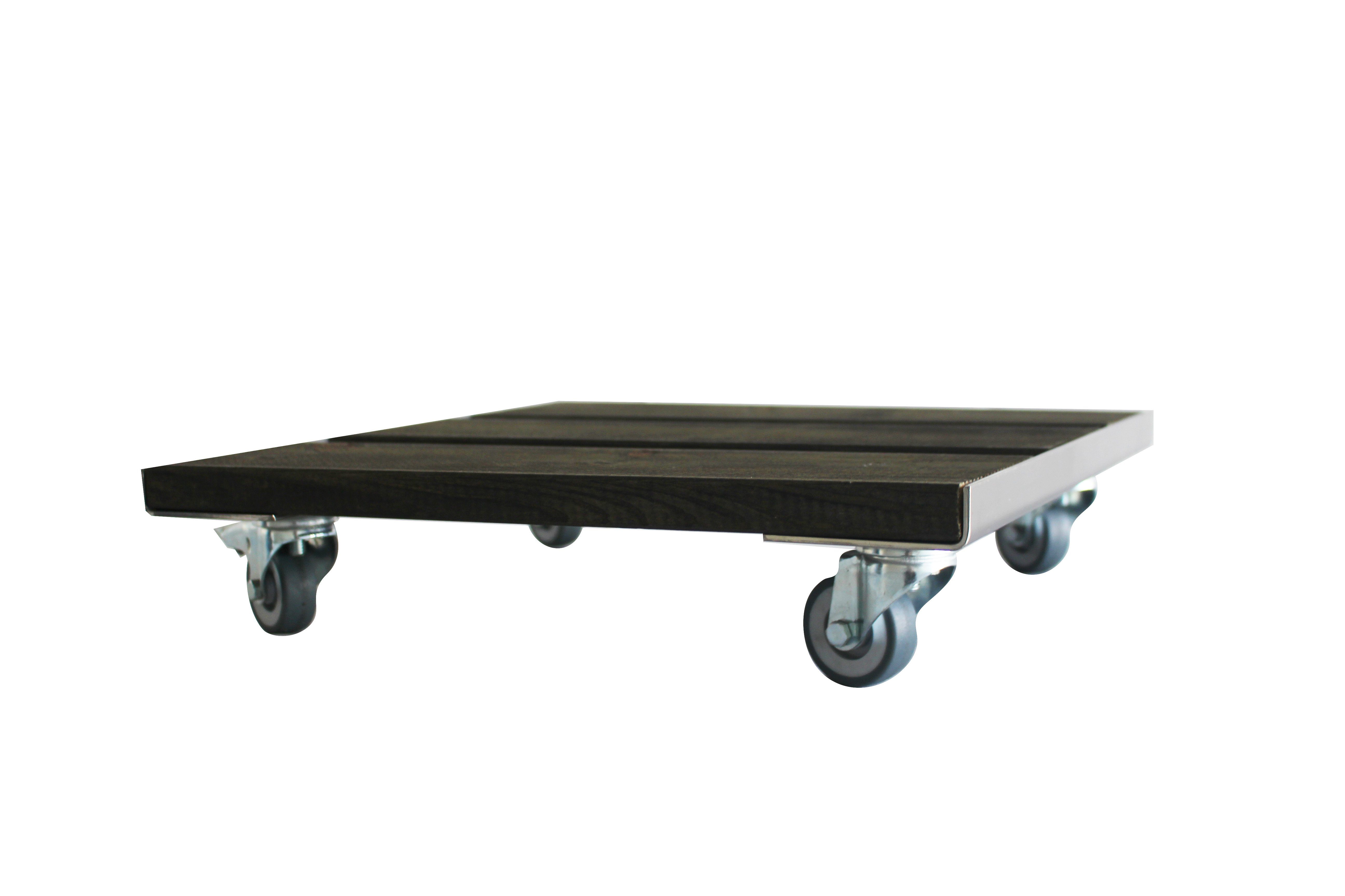 Serie Exklusiv Pflanzenroller Exklusiv-EH200 Belastung bis 200kg für In- und Outdoor Trag-Platte aus hochwertigen Holzdielen ohne überstehende Schraubenköpfe. Wählbar aus - hochwertige Bodendiele Douglasie glatt, teil geriffelt (D) - hochwertige Bodendiele teil geriffelt kesseldruckimprägniert Teak (T) - hochwertige Bodendiele teil geriffelt kesseldruckimprägniert grau/anthrazit (G) - hochwertige Bodendiele teil geriffelt kesseldruckimprägniert sand (S) Die hochwertige Bodendiele aus Douglasienholz (D) einem langlebigen Material mit guter Witterungsbeständigkeit schafft eine natürliche Optik. Die Diele besitzt eine feingeriffelte Oberfläche und gewährleistet bei Nässe einen optimalen Anti-Rutsch-Effekt. Die hochwertige Bodendiele ist speziell optimiert als Bodendiele für Terrassen (G) und Dank der Kesseldruckimprägnierung in Farbe grau/anthrazit ist das Holz entsprechend witterungsbeständig und langlebig. Die hochwertige Bodendiele ist speziell optimiert als Bodendiele für Terrassen (T) und Dank der Kesseldruckimprägnierung in Farbe Teak ist das Holz entsprechend witterungsbeständig und langlebig. Jedes Brett ein Unikat mit schöner natürlicher Maserung und ein nachwachsender Rohstoff. Daher sind Abweichungen von Produktabbildung möglich auch bedingt durch naturgegebene Eigenschaften. Beidseitig sind die Bodendielen mit gebürsteten Edelstahlwinkel in 3mm Dicke eingefasst und verschraubt. Bedingt durch diese hochwertigen Edelstahlwinkeln erhält der Pflanzenroller eine sehr hohe Stabilität und Steifigkeit im Verdrehen. Ein Herausbrechen der Rollen ist somit ausgeschlossen! 4x hochwertige, leise und bodenschonende Lenkrollen Thermoplastisches Gummi (TPE) mit einem Rad-Durchmesser von 50mm 2x mit Feststellbremse Thermoplastisches Gummi ist ein Material mit einem sehr geringen Schwenk und Rollwiderstand und bietet einen hohen und geräuscharmen Fahrkomfort. Die Rolle hat eine hohe chemische Beständigkeit, sogar gegen viele aggressive Medien. Einsetzbar im Temperaturbereich von -20Grad bis +60 Grad. Thermoplastisches Gummi ist bodenschonend und spurlos. Das Schwenklager besitzt einen doppelten Kugelkranz und ist mit einem Kunststoffring abgedichtet. Der Feststeller arretiert die Schwenk- und Radbewegung gleichzeitig! Gesamthöhe ca 90mm Tragfähigkeit bis 200kg! Размер 400x400 (3 Dielen) Размер 500x500 (4 Dielen) Keine überstehende Schraubenköpfe! Handgefertigt in Baden-Deutschland!