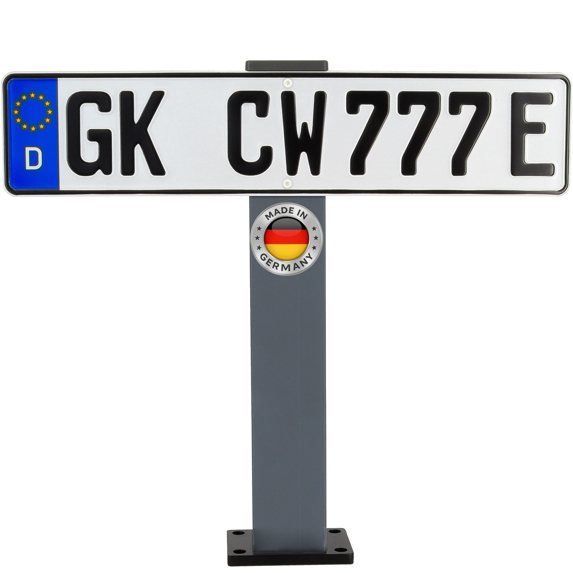Die robuste Konstruktion sorgt für Stabilität, Wetterfestigkeit und eine lange Lebensdauer. Durch die mitgelieferten Schrauben und die Fußplatte ist die Montage besonders einfach – das Kennzeichen wird mit zwei selbstschneidenden Schrauben sicher fixiert. Ideal geeignet für Privatgrundstücke, Firmengelände oder Besucherparkplätze.