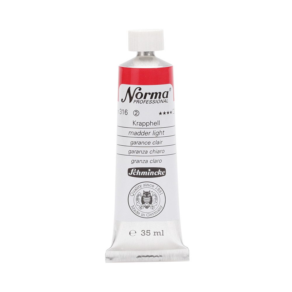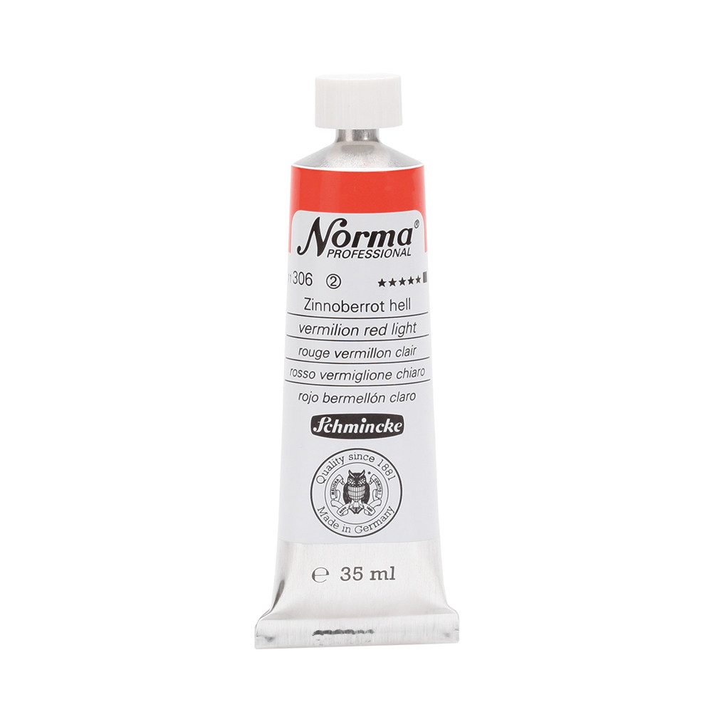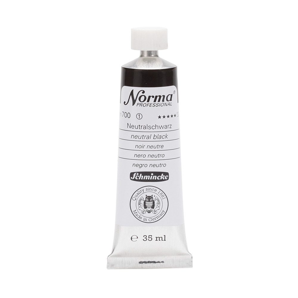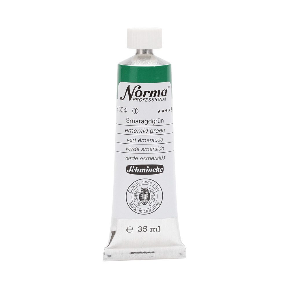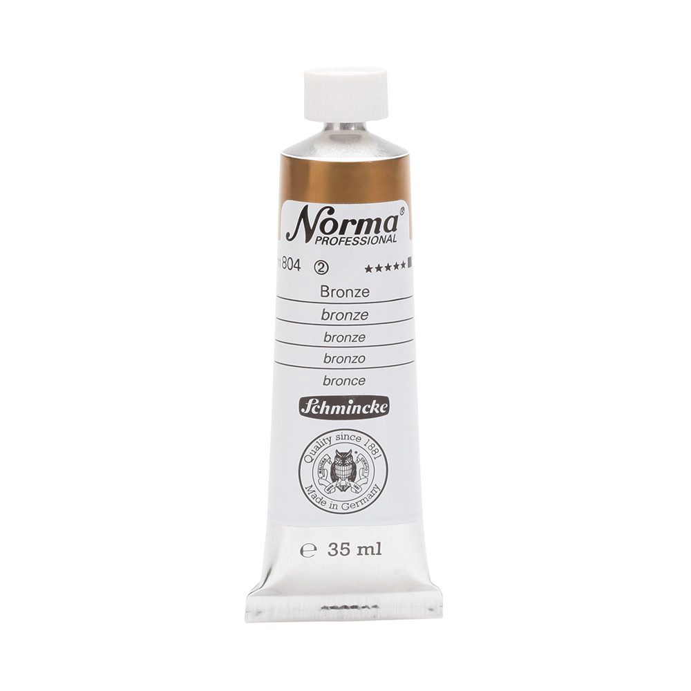 NORMA Professional ist eine moderne, umweltbewusst rezeptierte Ölfarbe feinster Qualität für die professionelle und anspruchsvolle Ölmalerei. Die sorgfältig ausbalancierte Palette, bestehend aus insgesamt 84 brillanten Farbtönen, umfasst sowohl klassische als auch moderne Farbtöne. Hierzu gehören 27 exquisite Lasurtöne sowie einige einzigartige Spezialfarben. Unter ihnen finden sich nicht nur hochlichtechte und deckende Chromgelbtöne, sondern auch Farben wie Mohnrot, Kobalttürkis, Achatbraun, Schweinfurter Grünton, Neutralschwarz, Gold, Silber und Bronze. Jeder der 84 Farbtöne verfügt dabei über höchste Lichtechtheit (4-5 звёзд). Bei der Entwicklung von NORMA Professional wurde ein besonderes Augenmerk auf die Verwendung natürlicher und nachwachsender Rohstoffe gelegt. Hochwertige, rein pflanzliche Ölmischungen sorgen für ausgezeichnete Haftung, optimale Pigmentaufnahme und minimieren die Neigung zur Gilbung. Die Verwendung erstklassiger, sowohl traditioneller als auch moderner Pigmente in höchster Konzentration garantiert eine außergewöhnliche Deckkraft, Leuchtkraft und Brillanz aller Farbtöne. Die Farben werden auf schonende Weise, traditionell auf Drei-Walzenstühlen angerieben und reifen vor der Abfüllung für 3 Monate, um eine optimale Entfaltung der Rohstoffe in der reinen Ölfarbe zu gewährleisten. Все Farben zeichnen sich durch ihre ausgewogene, cremig-buttrige Konsistenz aus, die für erstklassige Maleigenschaften und perfekte Werkspuren sorgt. Eine optimierte Rezeptur gewährleistet zudem eine verkürzte und harmonische Trocknungszeit aller Farbtöne, was zu brillanten und widerstandsfähigen Oberflächen führt. NORMA Professional kann uneingeschränkt mit allen Ölfarben von Schmincke sowie allen Öl-Hilfsmitteln gemischt und kombiniert werden.