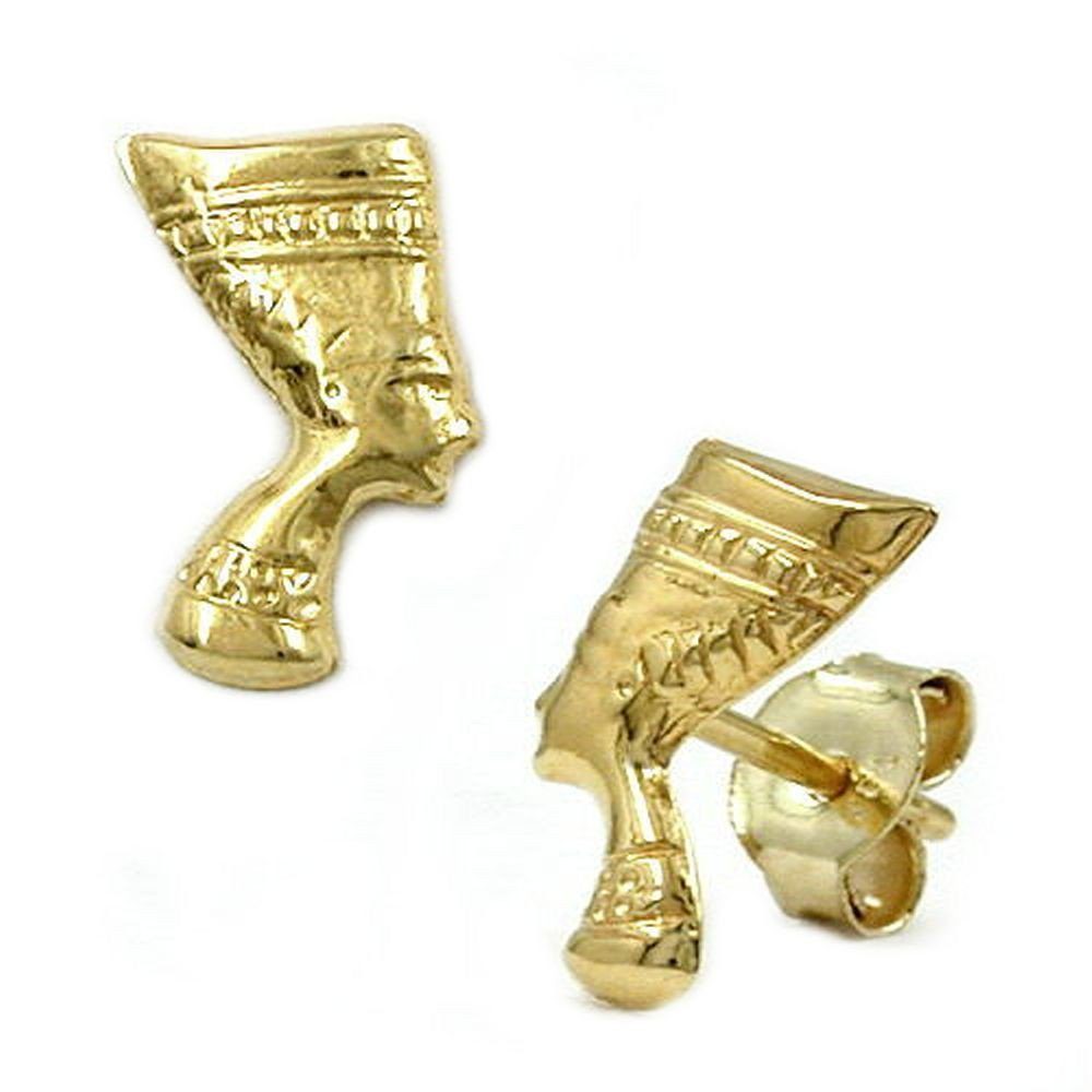 Dieser glänzende, 10x6mm große Ohrstecker in 375er Gelbgold (9 Karat) stellt sehr detailreich die Büste der sagenhaften ägyptischen Königin Nofretete (Queen Nefertiti) dar. Der Ohrring ist in hochwertiger Juwelierqualität gearbeitet, leicht ausgeformt und die Rückseite ist hohl. Die Ausstrahlung dieser wunderschönen, stolzen, klugen und mächtigen Frau, der Hauptgemahlin des Pharaonenkönigs Echnaton, die selbst gern unter dem Zeichen des Sonnengotts Aton stand, ist bis in heutige Zeit phänomenal. Ihr Abbild ist Sinnbild weiblicher Stärke und Durchsetzungskraft. Dieser stilvolle Ohrschmuck ist ein zeitlos schönes Geschenk und ein Kompliment für die Beschenkte.
