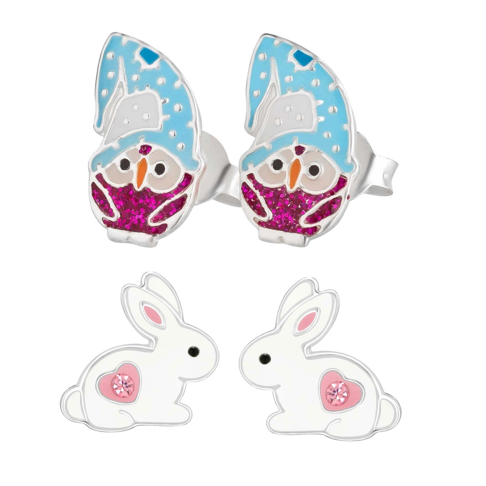 schmuck23 Ohrstecker-Set 2 x Kinder Ohrringe Hase Eule Wichtel 925 Silber Ostern (Geschenkset, Set aus 2 Paar Ohrringen), Mädchen Kinderschmuck 4 x Silikonverschluß extra