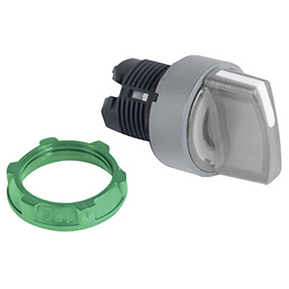 Leuchtwahlschalter aus Kunststoff als Frontelement und 22mm Einbaumaß, Baueihe Harmony XB5. Farbe des Leuchtwahlschalters ist weiss. Der Betätiger hat 2 Stellungen. Die Farbe des Außenrings ist grau. Die modularen Harmony Baureihen mit 22mm Einbaumaß kombinieren einfache Installation, Effizienz, modernes Design, Flexibilität mit höchster Robustheit. IP-Schutzklassen bis IP69K und Umgebungstemperaturen von -40°C bis +70°C. Produktstandards gem. EN/IEC 60947-5-1, EN/IEC 60947-5-4, CSA C22.2 No 14, UL 508, EN/IEC 60947-1, JIS C 4520. Zertifizierungen nach DNV, GL, UL gelistet, RINA, BV, CSA, LROS (Lloyds register of shipping). Produktstandards gem. EN/IEC 60947-5-1, EN/IEC 60947-5-4, CSA C22.2 No 14, UL 508, EN/IEC 60947-1, JIS C 4520