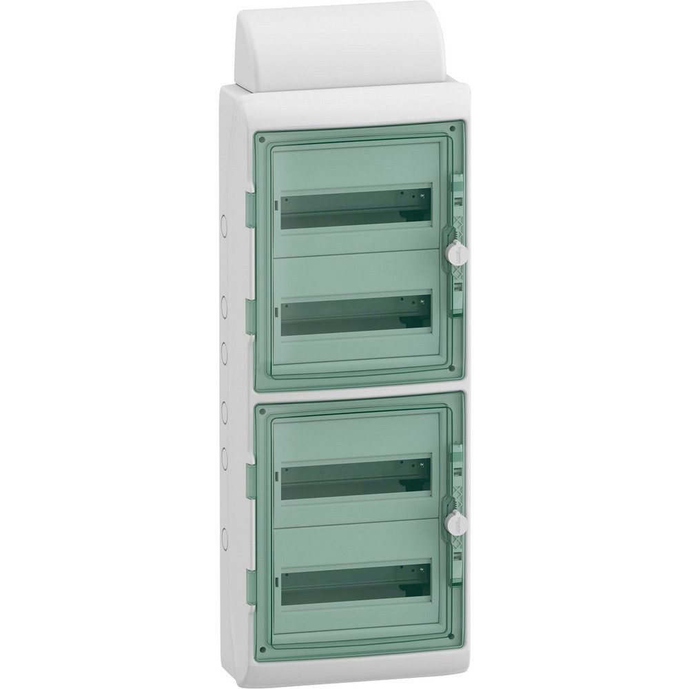 Das Feuchtraumverteilersytem Mureva von Schneider Electric bietet Platz für 48 modulbreite DIN Geräte in einer Reihe. Dieser Verteiler wird mit zwei transparenten Türe geliefert und wenn erwünscht auch mit einer Kabelabdeckung. Geeigent für Installationen im Innen- als auch im Außenbereich. Platz für 48 modulbreite DIN Geräte. Kabel können oben/unten/seitlich über Kabeleinführungsflansch eingeführt werden und zusätzlich über eine 2 Komponenteneinführung. Neue Steckklemmen - 1 Erdungs- und Neutralleiterklemme (3x25mm² + 11x4mm²) - sind im Lieferumfang.