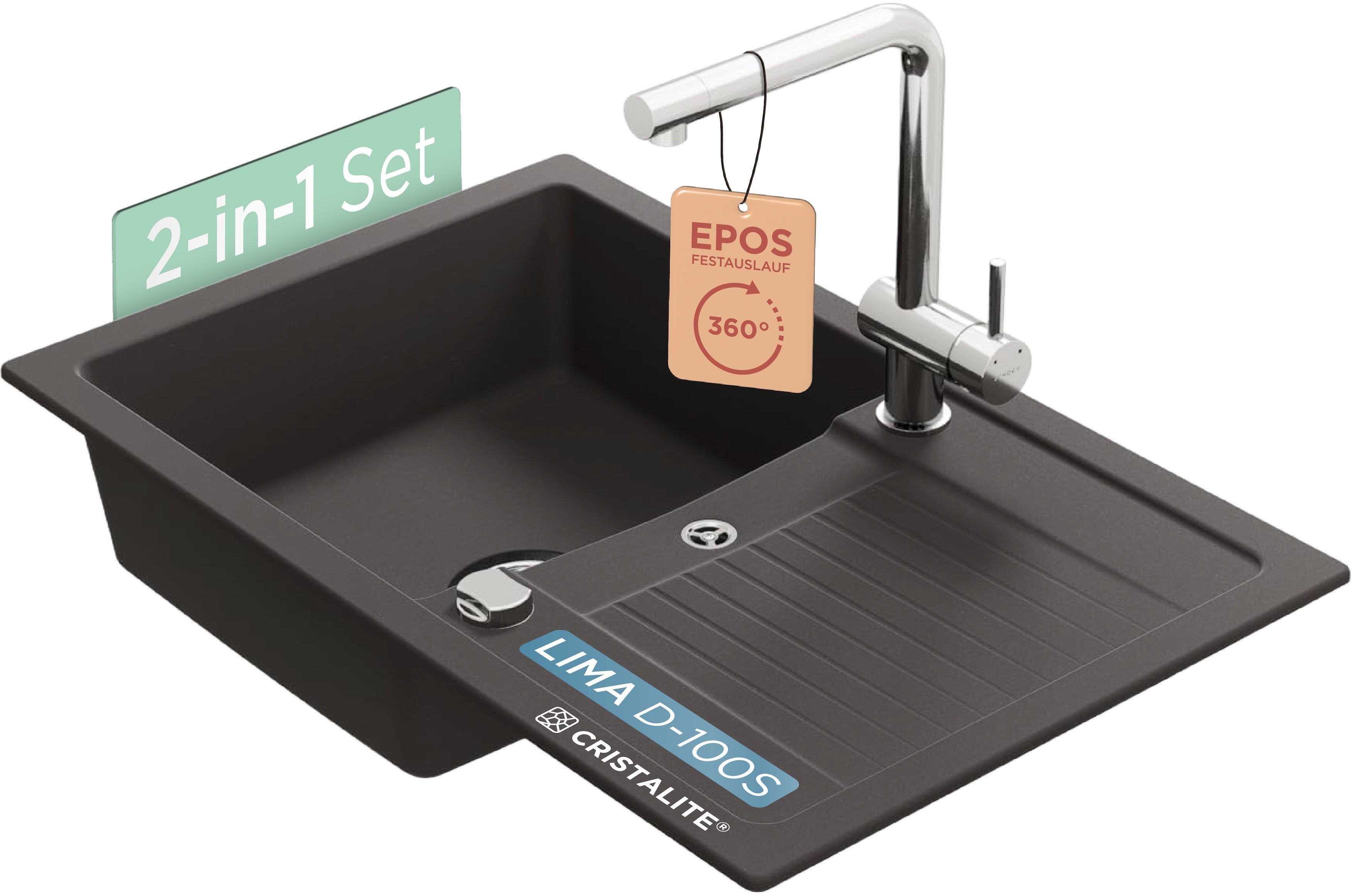 Lieferumfang | Spüle, Ablaufgarnitur mit Drehexcenter, Diamantbohrer, Armatur |