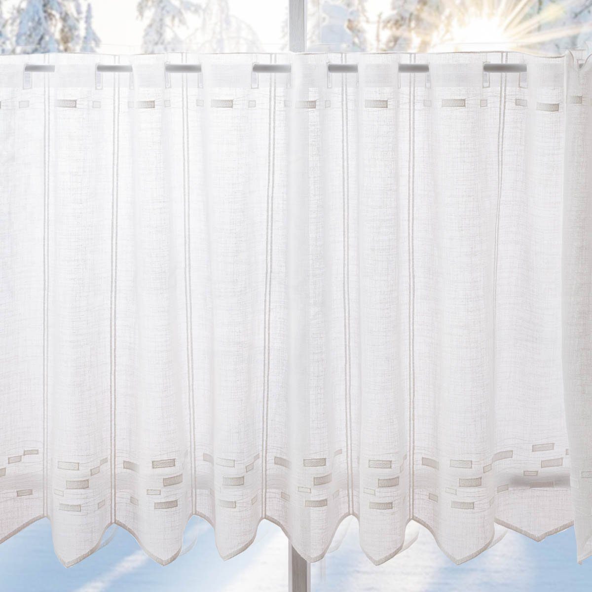 STICKEREIEN: Die Scheibengardine ist mit einem dezenten und modernen Dessin aus Wellen und Rechtecken bestickt.