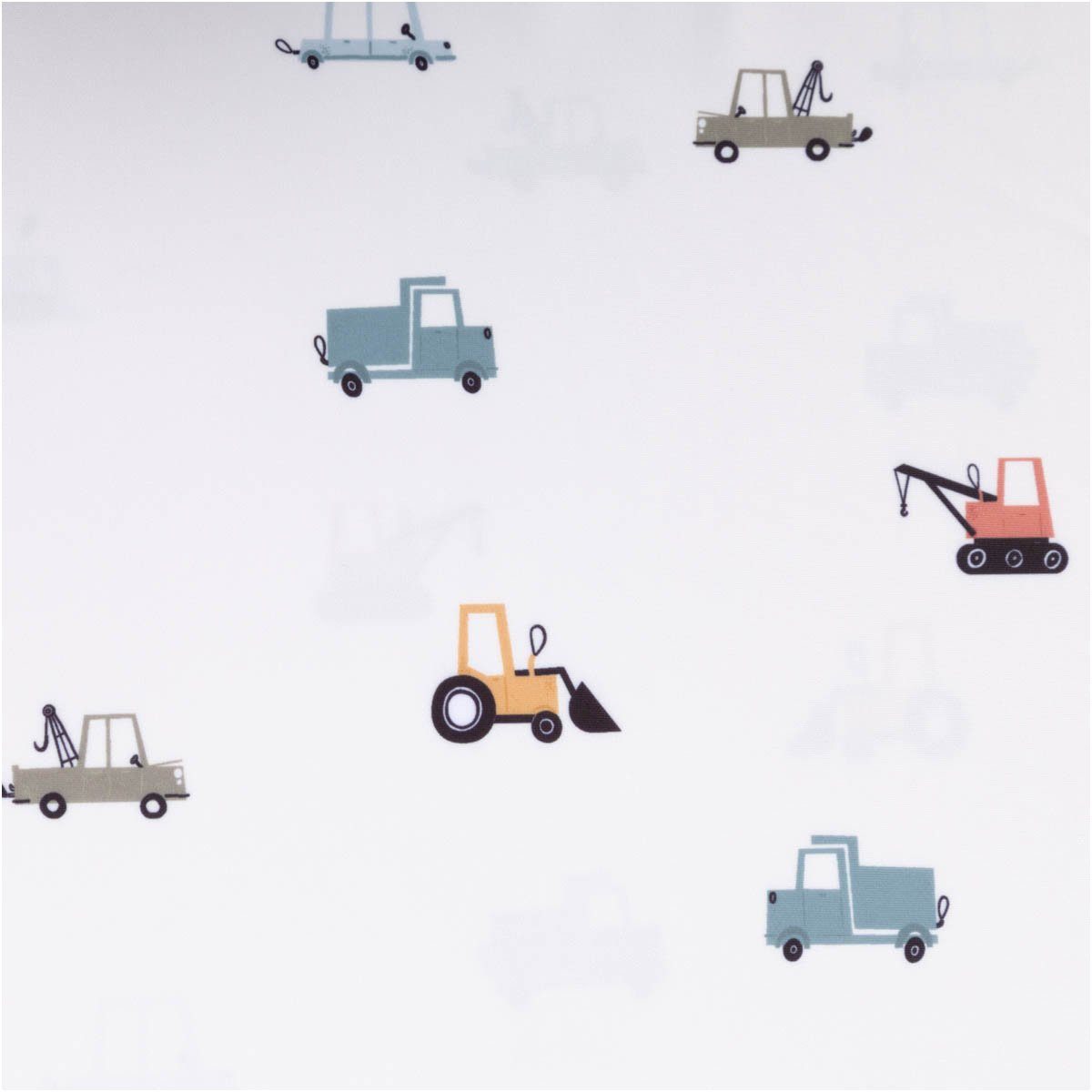 Badeanzugstoff mit bunten Baufahrzeugen auf wollweißem Hintergrund