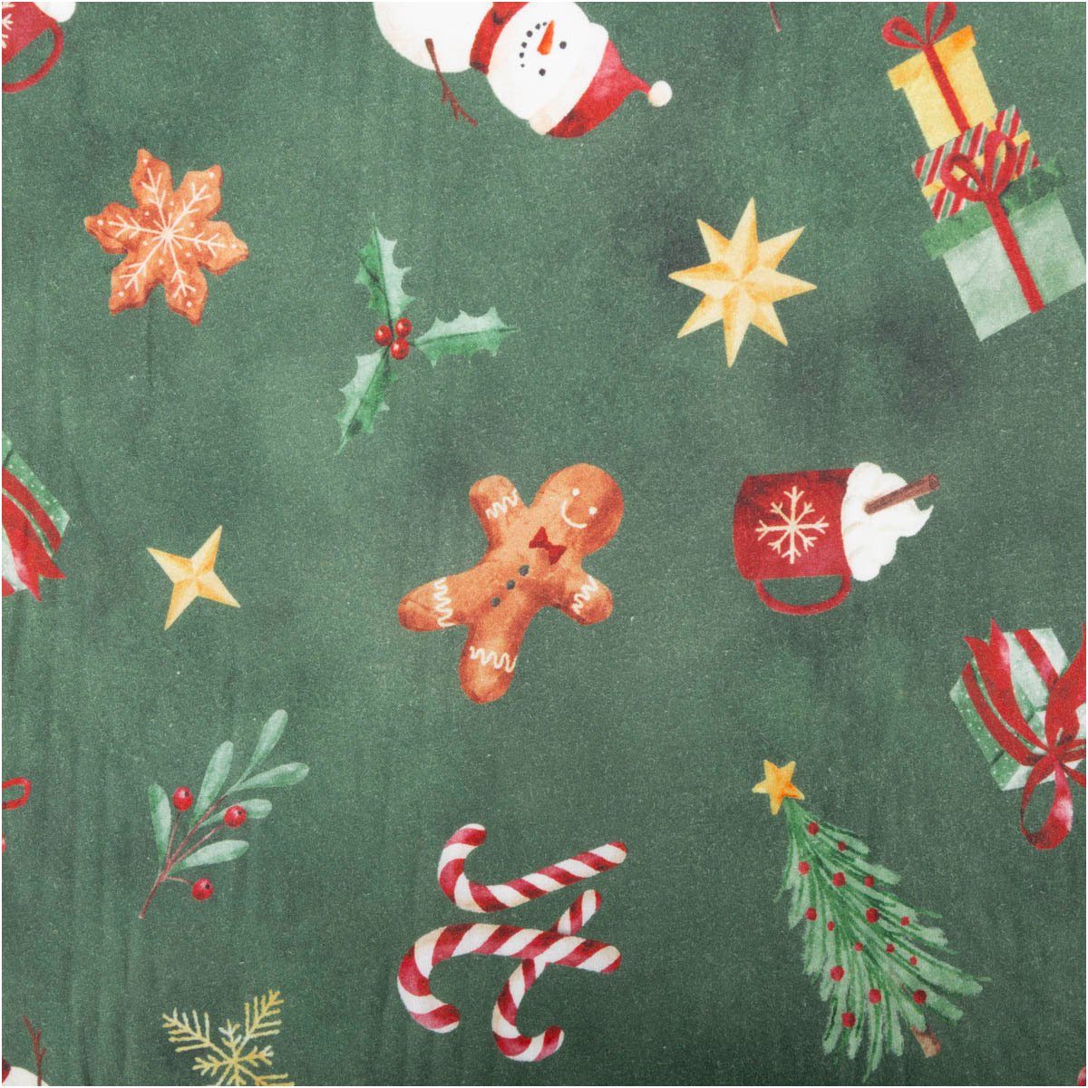 Dunkelgrün mit festlichen Motiven wie Schneemann, Zuckerstange & Tannenbaum