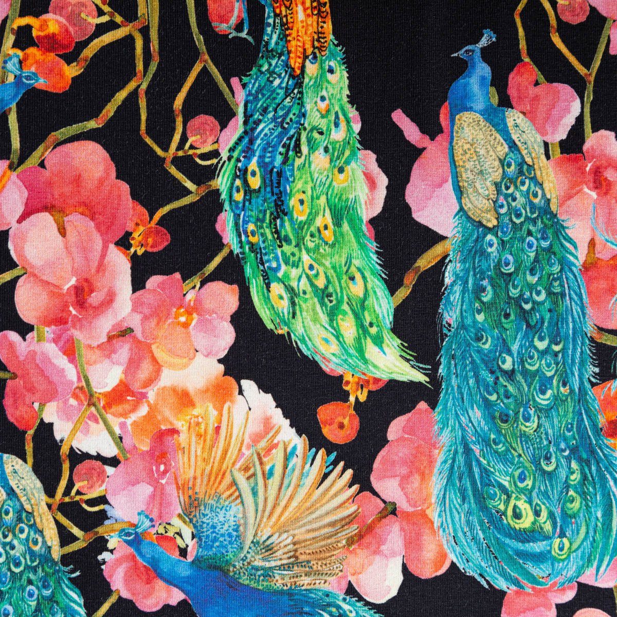 PFAUEN-PRINT: Herrlich weicher Jersey Stoff aus Baumwolle mit buntem Pfauen-Print im Digitaldruckverfahren.