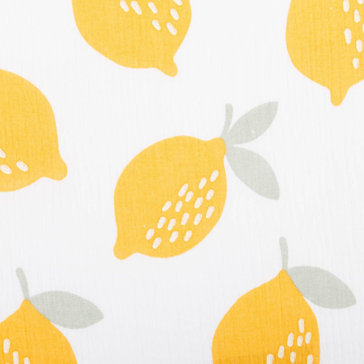VIELE PLUSPUNKTE: Der Musselin Stoff begeistert nicht nur mit seinem sommerlichen Zitronen-Print. Er ist angenehm griffig und weich, außerdem stark saugfähig, atmungsaktiv und auch noch pflegeleicht.