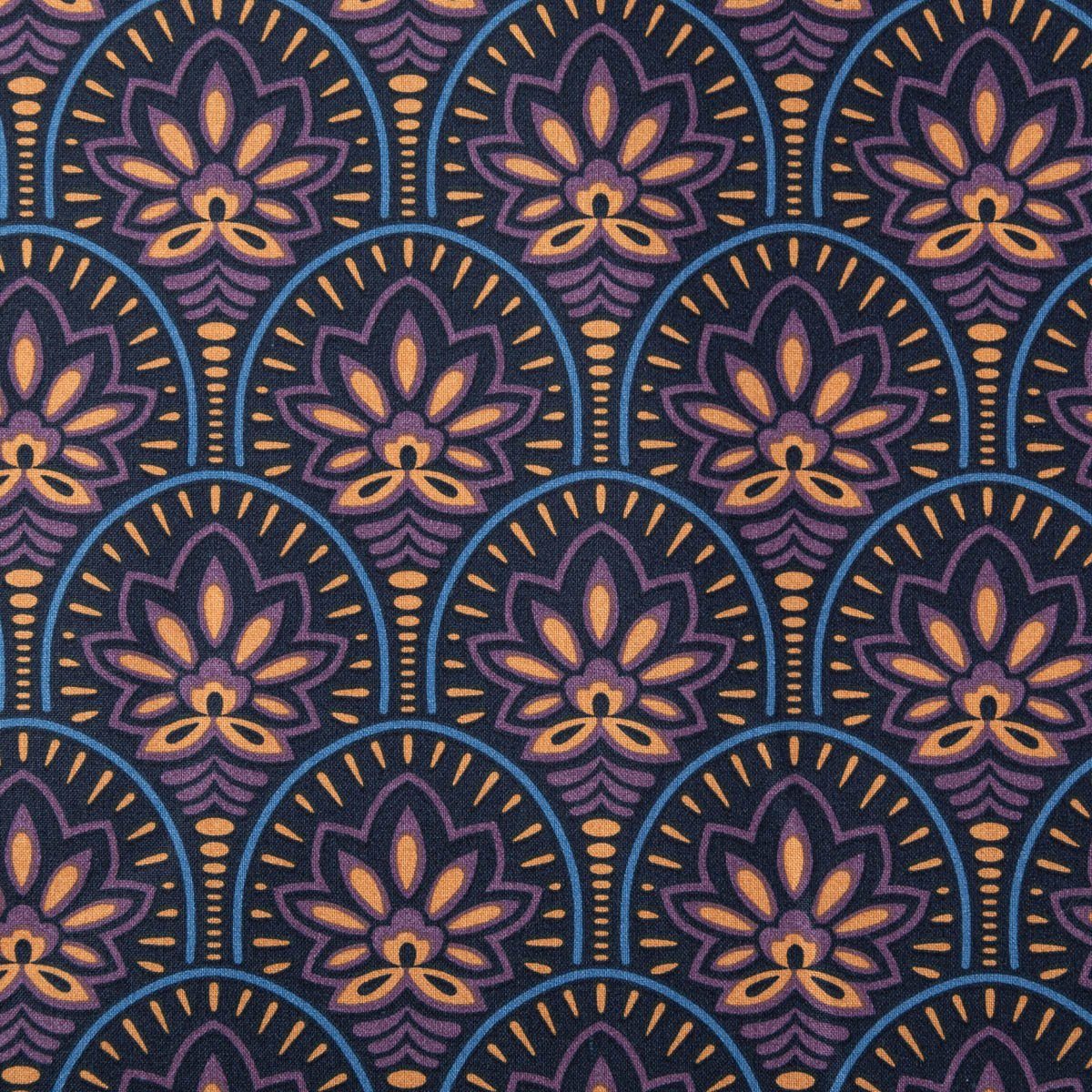 EXKLUSIVES DESSIN: Der beschichtete Tischdeckenstoff mit Art-Deco-Print in dunklem Blau ist ein exklusives Dessin von Poppy Fabrics.