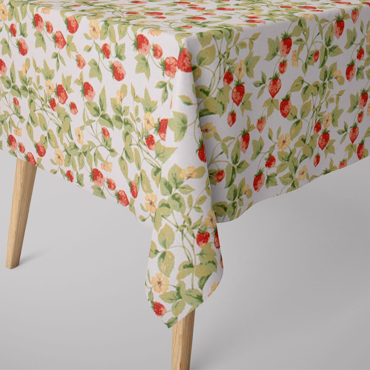 NATÜRLICH UND MODERN: Die wunderschönen, französischen Erdbeeren leuchten dir von der Tischdecke entgegen und bilden mit dem satten Blattgrün ein bezauberndes, frisches Motiv.