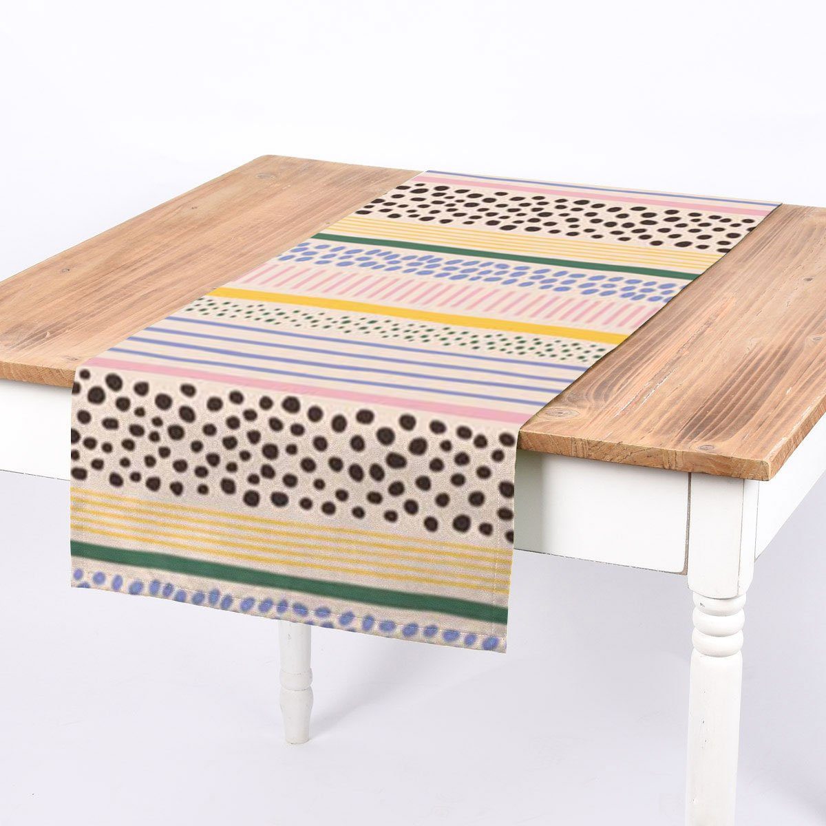 NATÜRLICH UND MODERN: Das abstrakte Dessin aus Strichen, Punkten und Streifen wirkt durch die knalligen Farben richtig modern und macht den Tischläufer zu einem farbenfrohen Hingucker.