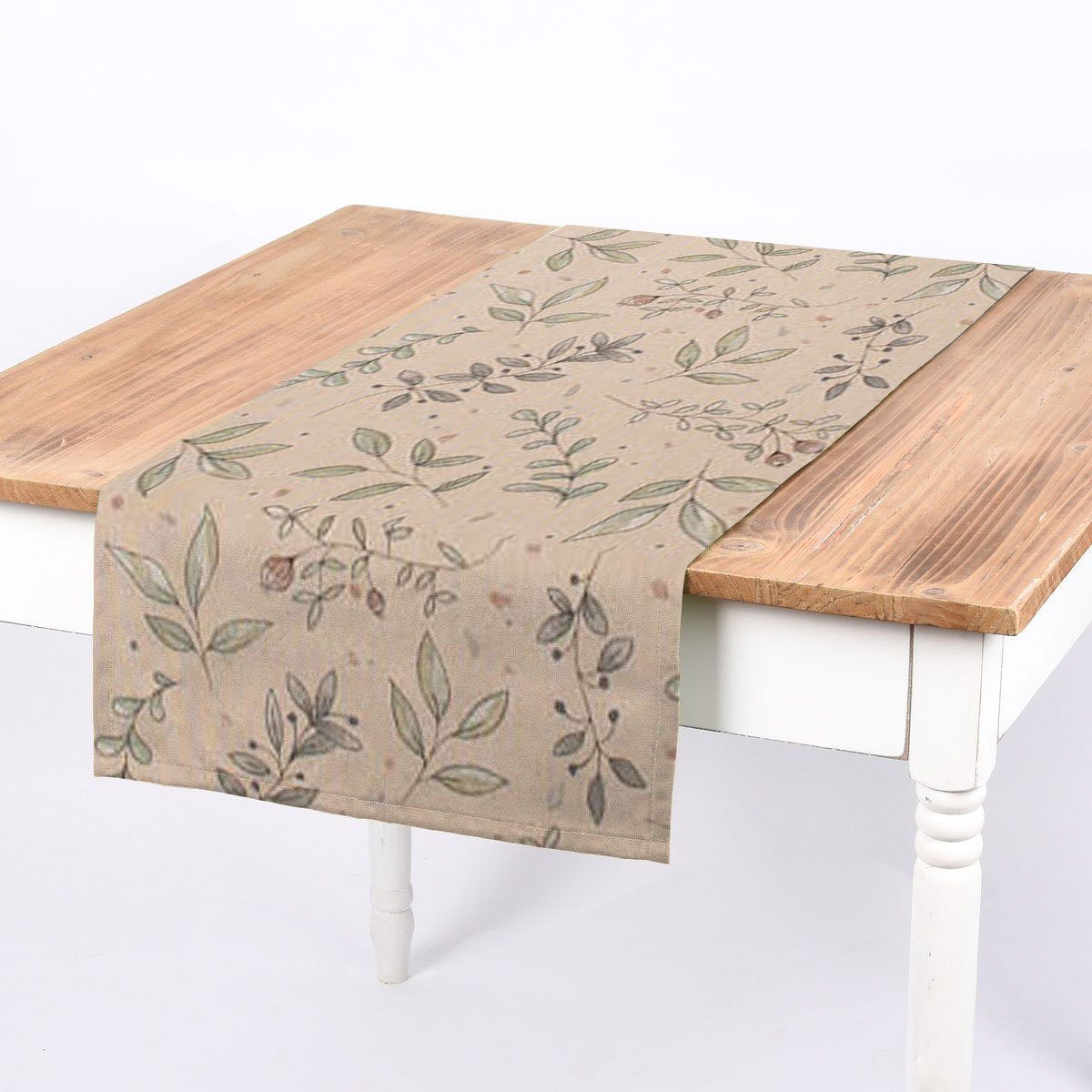 VIELSEITIG EINSETZBAR: Ob auf dem Tisch im Ess- oder Wohnzimmer, auf der Schlafzimmerkommode oder auf dem Sideboard im Flur – der Tischläufer mit Blätterzweigen in hellen Grüntönen auf naturfarbenem Untergrund ergänzt Dein Interieur perfekt und bringt Gemütlichkeit in Dein Zuhause