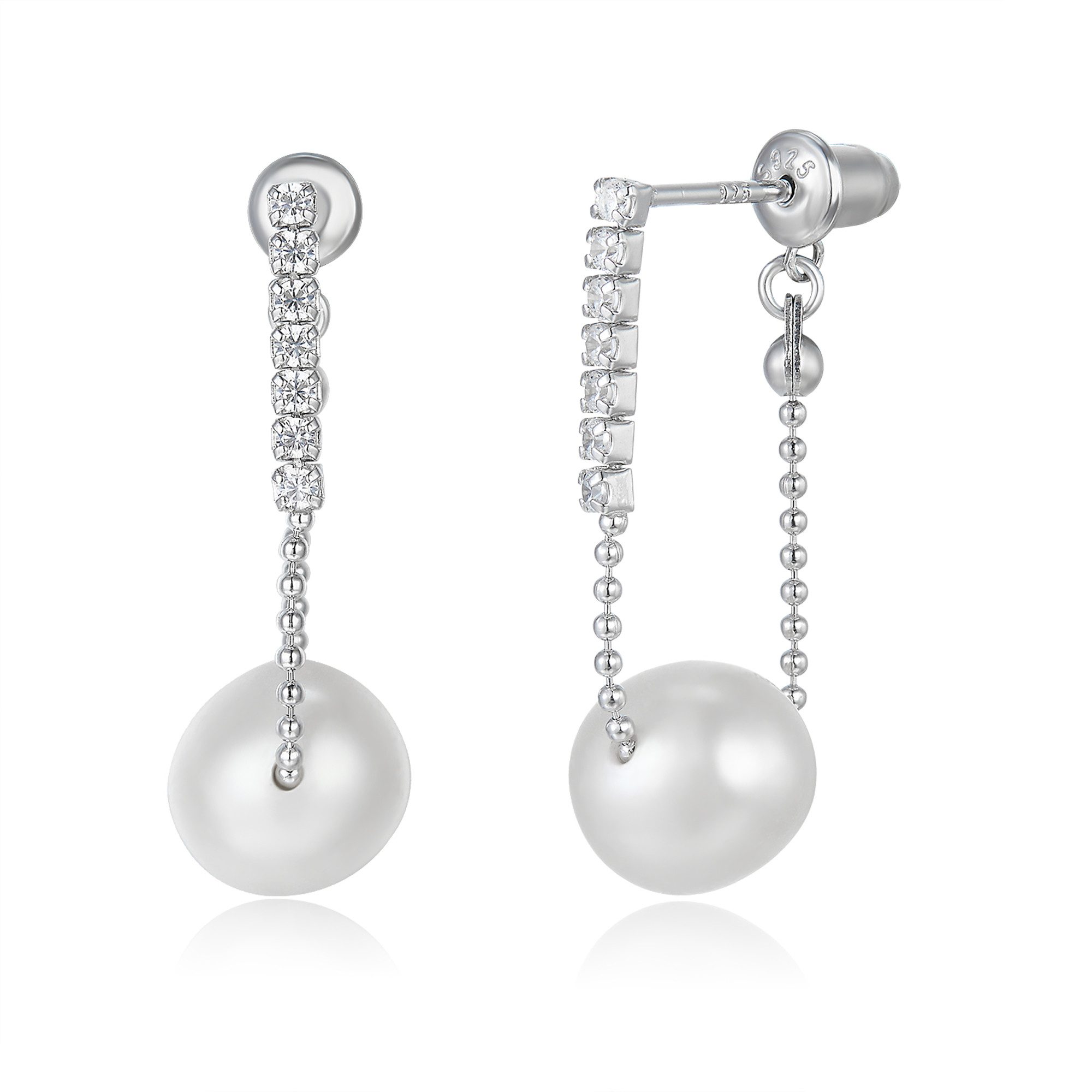 Die stilvollen Ohrhänger mit runder Süßwasser-Zuchtperle verkörpern zeitlose Eleganz und feminine Raffinesse. Ihr trendiges Design setzt auf harmonische Details: Auf eine feine, bewegliche Kette aus 925er Silber ist eine edle Süßwasserperle mit einem Durchmesser von ca. 8 mm aufgefädelt. Diese verleiht dem Schmuckstück eine klassische Note und unterstreicht seine exklusive Ausstrahlung. Entlang der Vorderseite des Ohrsteckers sind sieben kleine Zirkonia eingefasst. Die Steine setzen glitzernde Akzente und lassen die Ohrringe bei jeder Bewegung dezent schimmern. Mit einer Gesamtlänge von ca. 24 mm bietet der Ohrschmuck eine perfekte Balance zwischen Eleganz und Understatement. Dank ihres detailreichen Designs eignen sich die Perlenohrhänger für eine Vielzahl von Anlässen. Sie sind sowohl im Alltag als auch zu besonderen Momenten, wie festlichen Events, Hochzeiten oder romantischen Abendessen, ein eleganter Begleiter. Die Kombination aus glänzendem Echtsilber, schimmernder Perle und glitzernden Kristallen passt mühelos zu klassischen sowie modernen Outfits. - Gesamtlänge: 24 mm. - Kettenlänge: ca. 5 cm. - Verschluss: Steckerverschluss. - Material: 925 Silber rhodiniert, Zirkonia (synth.) - Gewicht pro Paar: ca. 2,6 Gramm.