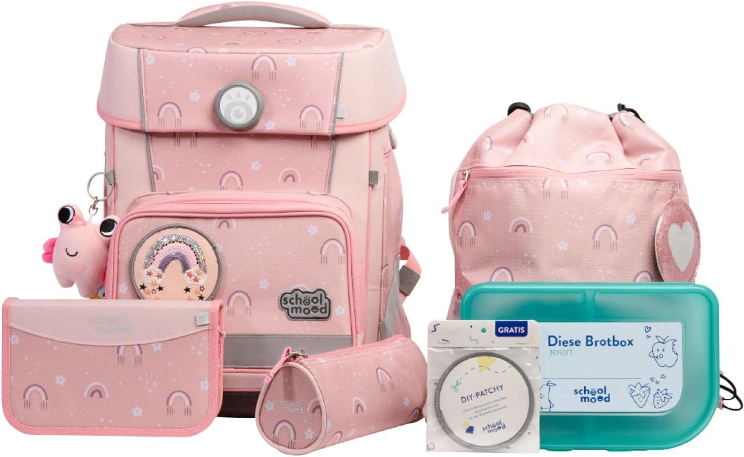 Lieferumfang | Die Rückgabe beinhaltet das Gesamtangebot. Turnbeutel, Etui (21-tlg., Markenfüllung von Eberhard Faber), Schlamperrolle, Brotdose, 3-tlg. Patchy-Set, LED-Patchy und einen Plüschanhänger "Moodie" |