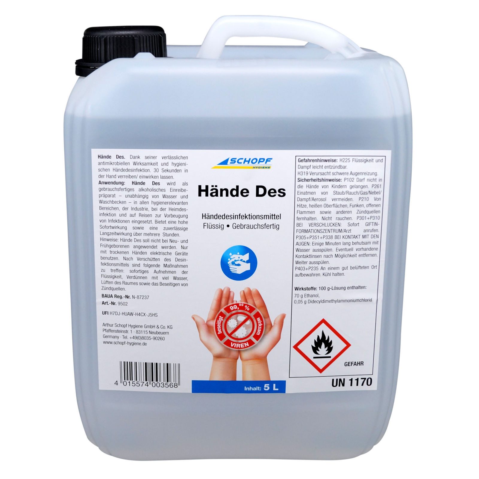 Schopf Hände Des ist ein flüssiges, gebrauchsfertiges Händedesinfektionsmittel zur Vorbeugung vor Infektionen und zum Schutz vor Krankheiten. Die sehr verlässliche Wirksamkeit ist antimikrobiell. Beseitigt 99,9 % der Viren und dient der hygienischen Händereinigung ohne Wasser.