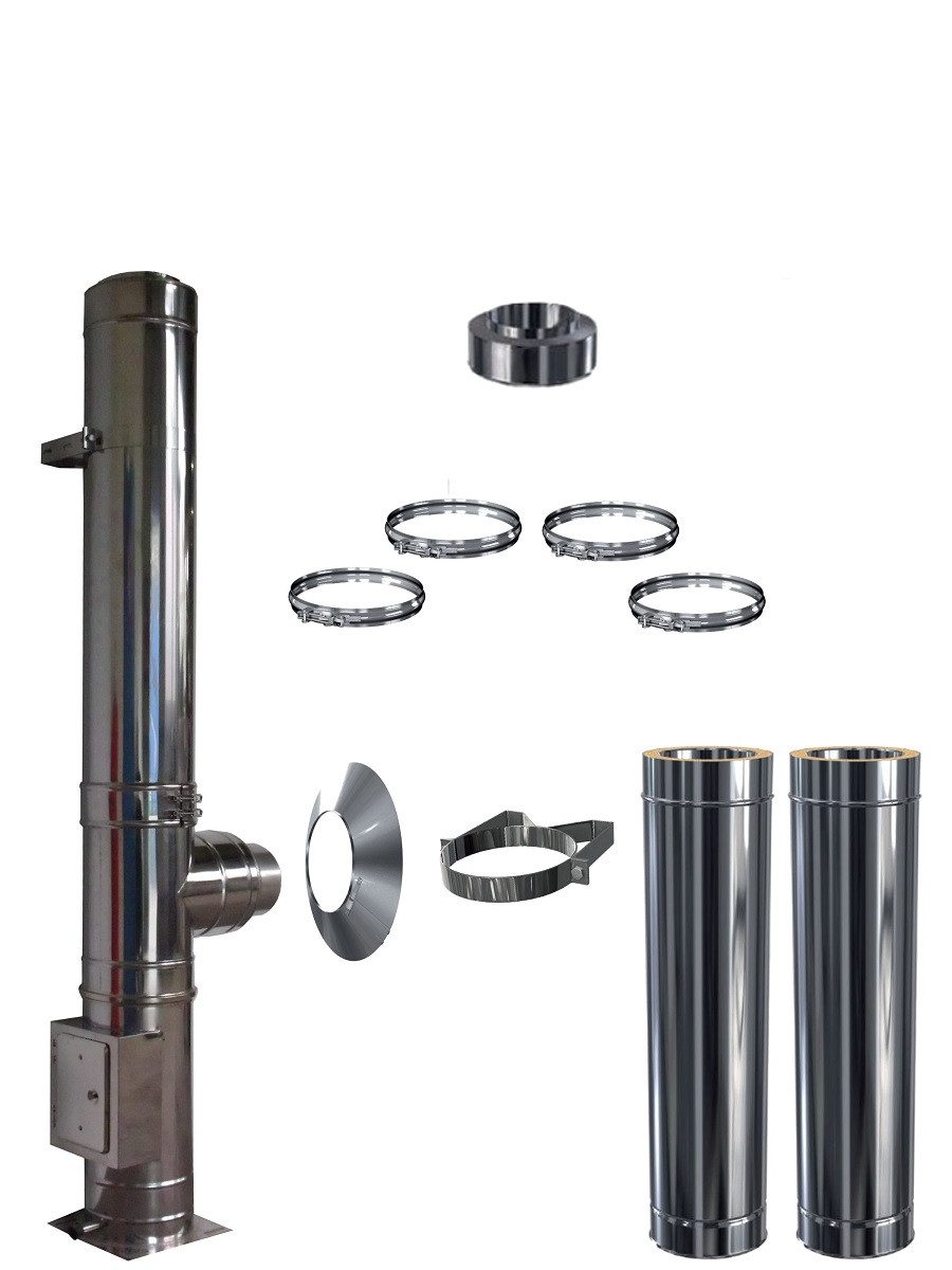 Doppelwandiger Edelstahlschornstein Schornstein Komplett Bausatz DW 150 Höhe 3,2 - 9,7 m Edelstahlschornsteinsystem in doppelwandiger wärmegedämmter Ausführung mit Materialstärke 0,5. Der Durchmesser des Innenrohres beträgt 150 mm bei einer Dämmstärke von 30 mm. Das Innenrohr ist aus hochwertigem 1.4521 (AISI444) Edelstahl gefertigt, das Außenrohr aus 1.4509 (AISI441) Edelstahl mit einem Außendurchmesser von 210 mm. Все Bauteile sind Plasma / WIG verschweißt. Die Применитьung erfolgt industriell nach DIN EN ISO 9001. Unsere Schornsteinsysteme sind geprüft durch den TÜV/ das Materialprüfungsamt Nordrhein-Westfalen. Zugelassen für Öl, Gas und Kaminholz (keine Pellets, keine Kohle) bis zu einer Dauerbetriebstemperatur von 600 Grad Celsius. Ausbrandsicher bis 1000 Grad Celsius. Bitte beachten Sie, dass bei unserer Angabe der Höhe des Schornsteins es sich um die gestreckte Длина handelt. Die gestreckte Длина bezeichnet die Addition der Длинаnangaben der einzelnen Elemente des Schornstein-Systems. Wir weisen Sie darauf hin, dass beim Zusammenführen von 2 einzelnen Elementen ca. 6 cm Einstecktiefe verloren gehen.