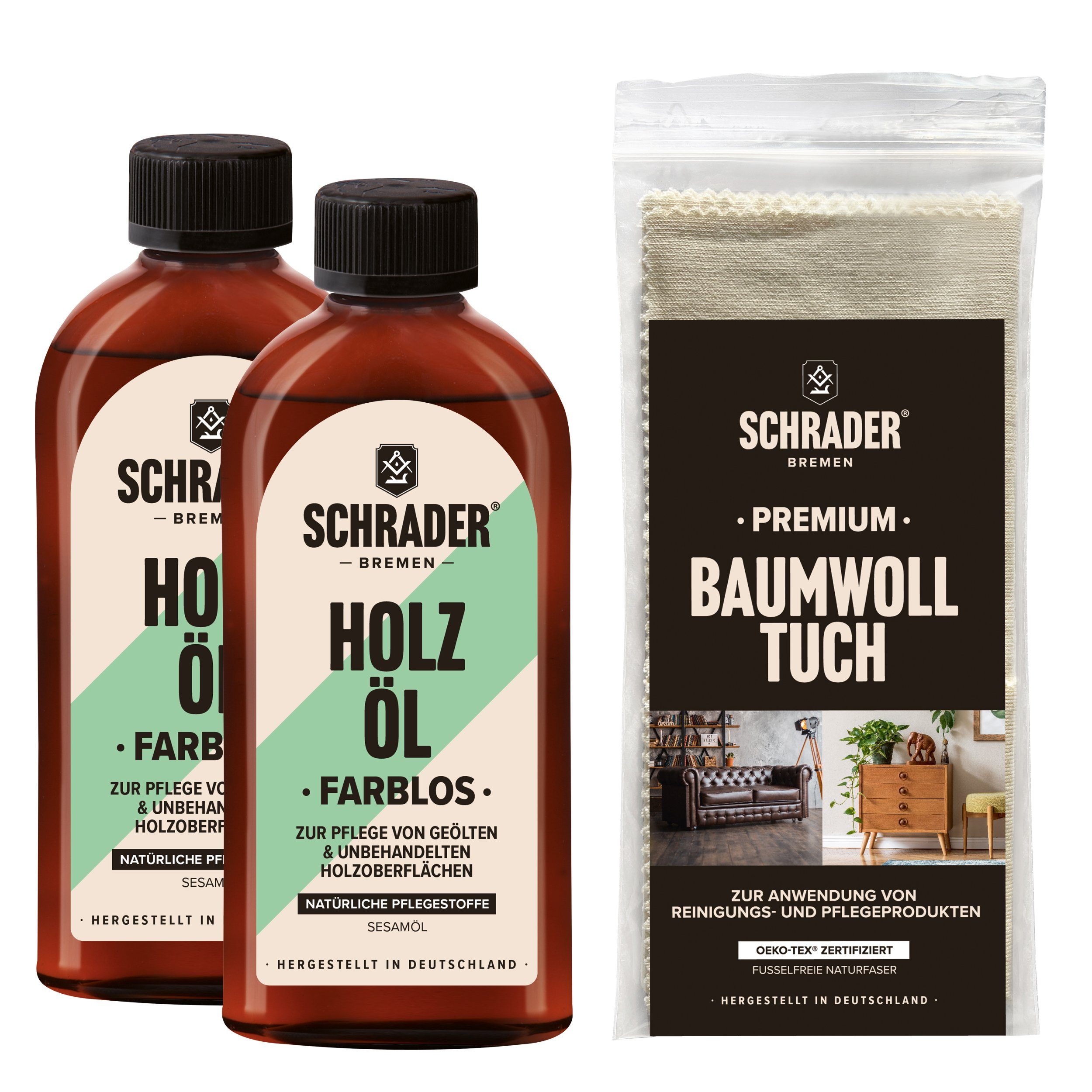 Pflegeset mit 2x 250 ml Holz Öl Farblos und 1x Premium Baumwolltuch (25 x 33 cm)