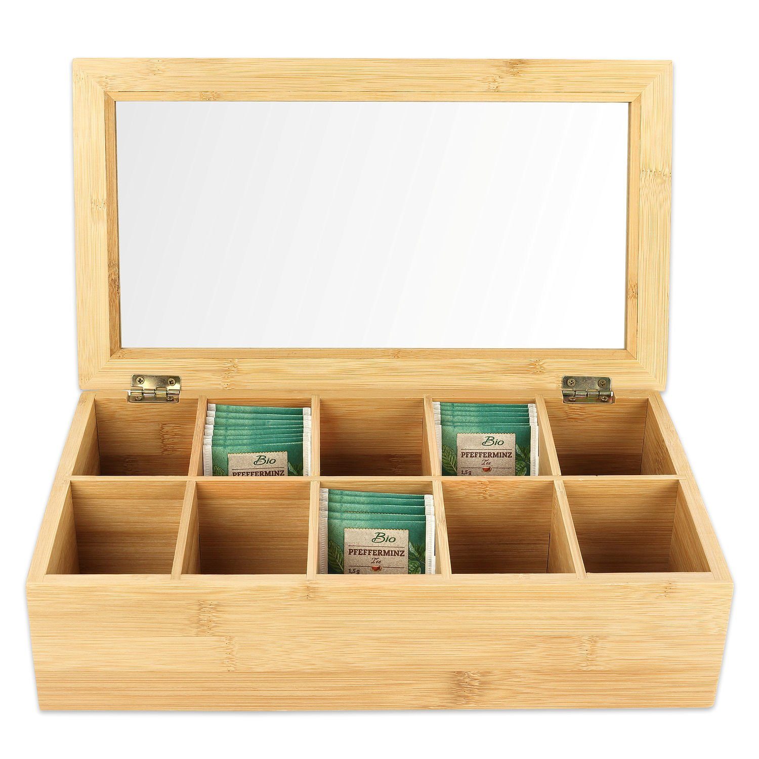 • Schramm® Teebox aus Bambus Tee Box Deckel 36x20x9cm mit 10 Fächern Teekiste mit Sichtfenster Teebeutelbox Teekasten Tee Box