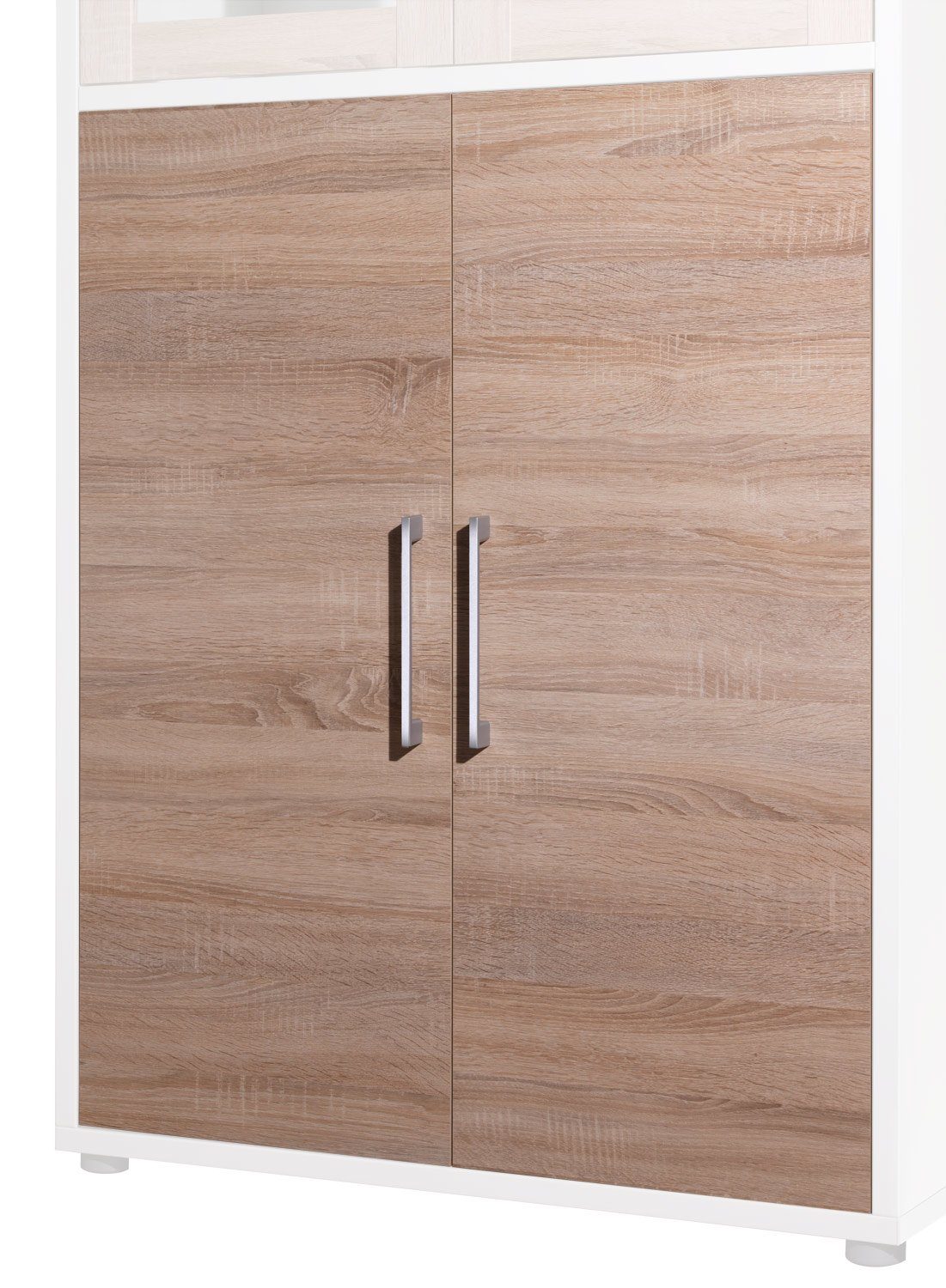 Sorgen Sie für eine aufgeräumte Arbeitsatmosphäre: Hinter diesen Türen verwinden Ordner, Mappen und Büro-Kirmskrams im Nu. Das Türen-Set ist die optimale Ergänzung zu unserem Regalsystem. Es schafft nicht nur Ordnung, sondern bringt dank seiner Fronten aus Eiche Strucktur Nachbildung auch eine warme Komponenete in Ihr Büro. Die silber lackierten Griffe runden den modernen und gleichzeitig angenehm wohnlichen Look ab. So macht arbeiten wieder Spaß. Tipp: Besonders schön zur Geltung kommen die Eichen-Türen in der angesageten Two-Tone-Optik, also kombiniert mit einem weißen Regalkorpus oder weiteren Türen in Weiß oder aus Glas. Der große Vorteil unseres Regelsystems ist, dass es sich Ihren individuellen Bedürfnissen anpasst. Sie können die beiden Drehtüren dieses Sets an unterschiedlichen Regalen unserer Serie anbringen, egal ob oben oder unten, zusammen mit weiteren Türen oder allein. Stellen Sie sich Ihr optimales Büro selbst zusammen. Stöbern Sie dazu doch durch unseren Shop und entdecken Sie auch die weiteren Artikel unseres Regalsystems. Das Türen-Set für das Regalsystem besteht aus zwei Drehtüren inklusive Türscharnieren und hat die Maße B/H/T: ca. 84x105x2 cm.