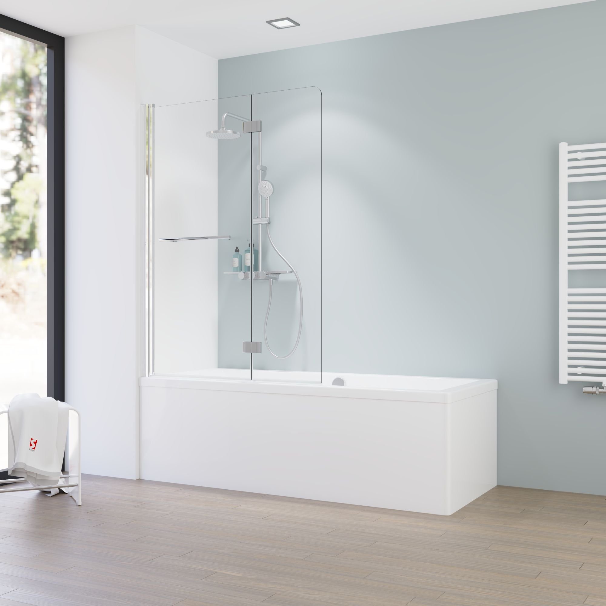 Nur eine Badewanne zuhause, aber trotzdem komfortabel duschen ohne das Bad zu überfluten? Das geht! Mit dieser 2-teiligen Duschabtrennung von Schulte. Mit einer Breite von 112 cm und Höhe von 150 cm bietet die faltbare Duschwand einen großzügigen Spritzschutz und sieht dabei optisch ansprechend aus. Das 5 mm starke Sicherheitsglas (ESG) ist stabil und langlebig. Der integrierte Heb-Senk-Mechanismus im Wandprofil sorgt für ein sanftes Schwenken der Glaselemente. Das zeitlose Design mit eckigen Scharnieren und Profilen - wählbar in den Farben Mattschwarz oder Chromoptik - passt in verschiedene Badkonzepte. Der mitgelieferte Handtuchhalter dient gleichzeitig als Griff zum Bewegen der Faltwand. Die Montage ist sowohl links als auch rechts möglich - ideal für jede Einbausituation.