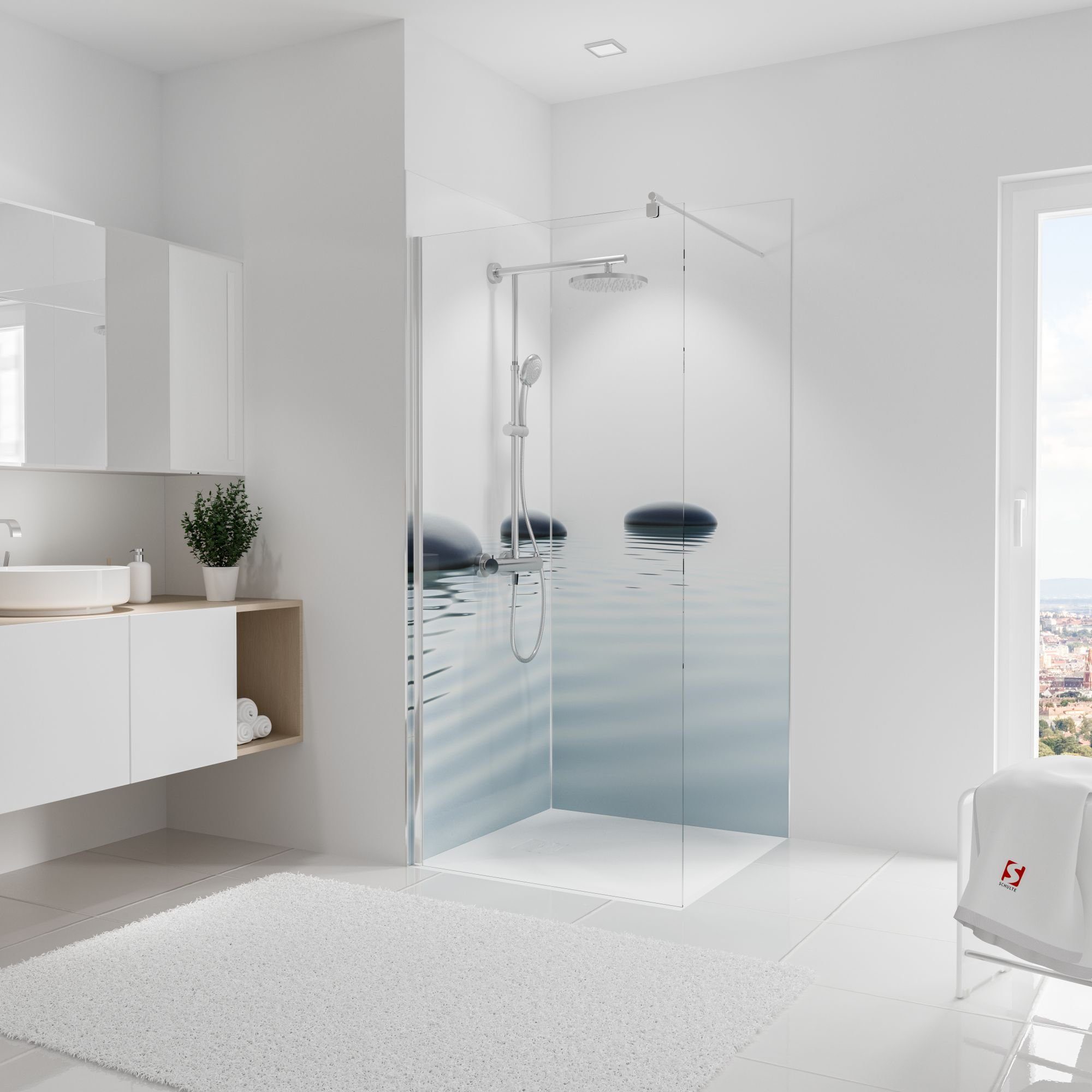 Die Duschrückwand „Zen Steine + Wasser“ vermittelt die beruhigende Wirkung eines Zen-Gartens mit fließendem Wasser. Der digitale Direktdruck auf 3 mm starken Aluminium-Verbundplatten zeigt Zen-Steine und Wasser, die perfekt miteinander harmonieren. Die Rückwand ist kratzfest, UV-beständig und pflegeleicht – ideal für eine entspannende Atmosphäre.