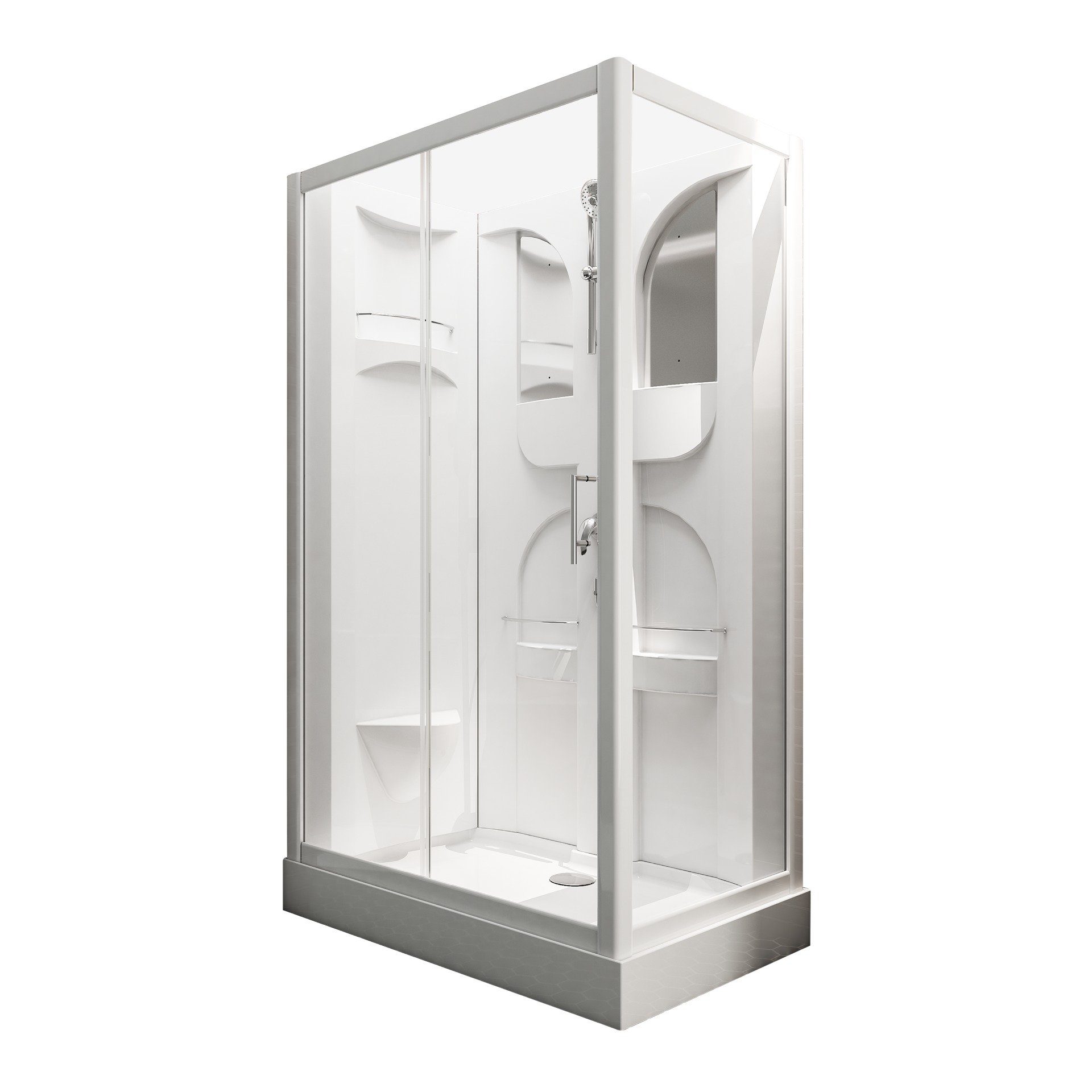 Lieferumfang | 1 Schiebetür 1 Festelement 1 Seitenwand 2 Rückwände Duschwanne mit integrierter Schürze und Ablauf Duschstangengarnitur mit Einhebelmischer integrierter Sitz 2 Spiegel 3 Ablageflächen Montagematerial Montageanleitung |
