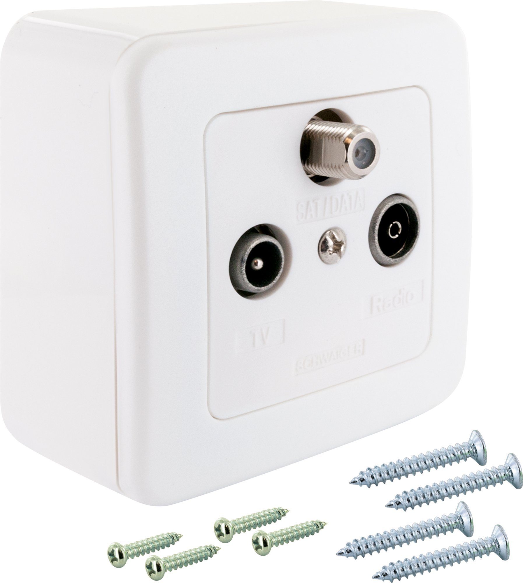 Dieses SCHWAIGER® Set besteht aus einer Multimedia Durchgangsdose, einem Aufputzkasten und einem Abdeckrahmen. Die Dose ist für den Einsatz an Breitbandkabelanlagen geeignet und als Durchgangsdose mit Triple Play für Internetdienste konzipiert. Die Anschlüsse wurden zum Schutz gegen Brummspannung und Ausgleichströme galvanisch getrennt. Sie ist für den Fernseh- und Rundfunkempfang sowie für das Internet geeignet. Dank der speziellen Klemmtechnik müssen die Kabelanschlüsse nicht verschraubt werden.