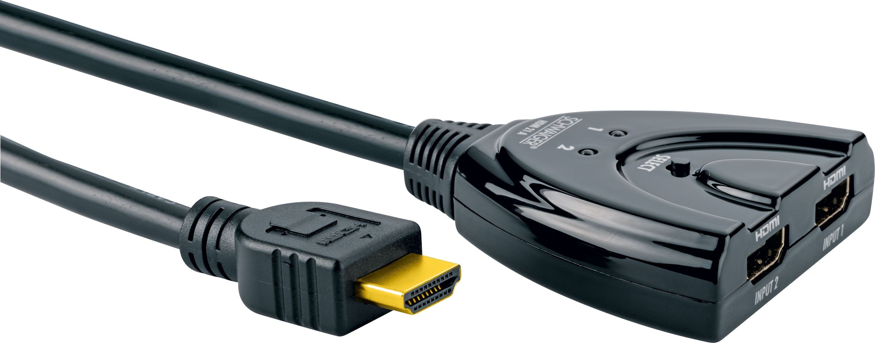 Mit diesem SCHWAIGER® HDMI®-Umschalter können zwei digitale Wiedergabequellen (Bild und Ton) mit einem HDMI-fähigen Wiedergabegerät betrieben werden. Das bedeutet beispielsweise, man kann 2 Geräte wie DVD Player und Set-Top-Box an ein Fernsehgerät anschliessen. Der Umschalter arbeitet automatisch und die eingestellten Kanäle werden per LED am Umschalter angezeigt. Er benötigt keine separate Stromversorgung und ist ohne Installation einer Software sofort betriebsbereit.