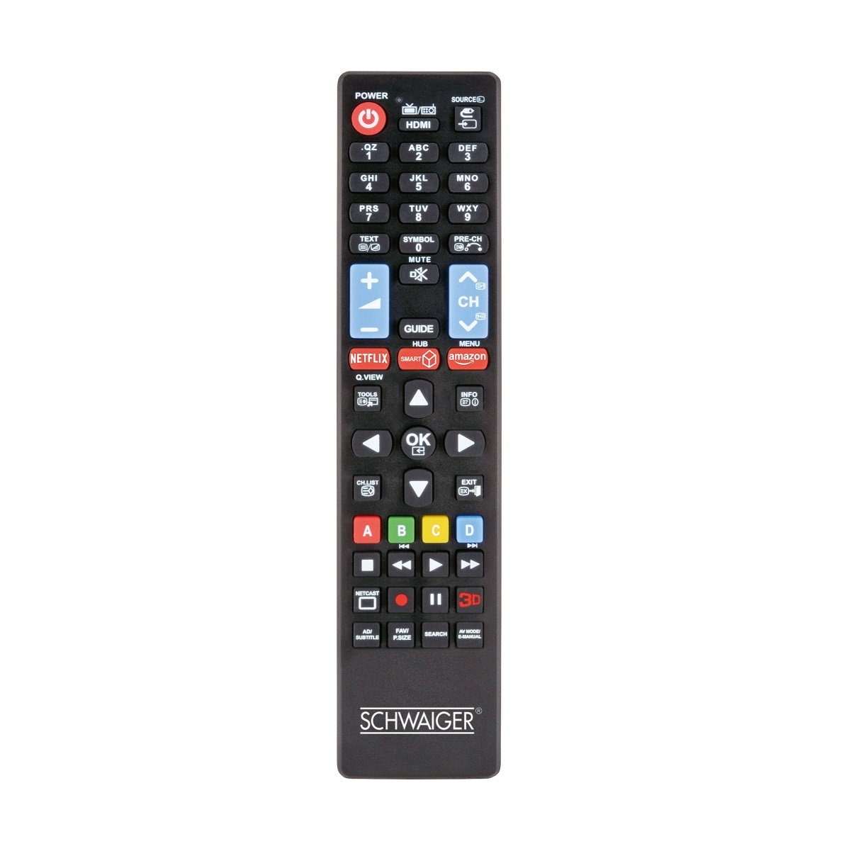 Unsere SCHWAIGER® Fernbedienung ist der ideale Ersatz für defekte oder verlorengegangene Originalfernbedienungen. Steuern Sie auch weiterhin absolut zuverlässig Ihr TV-Gerät der Marke LG, Samsung, Sony, Panasonic oder Philips, wobei die Ersatzfernbedienung mit markenspezifischen Sondertasten dem Original in puncto Design, Komfort und Bedienbarkeit in nichts nachsteht. Ausgestattet mit allen essenziellen Funktionen auf insgesamt 49 Tasten kann das Modell sofort ohne aufwendiges Anlernen für nahezu jeden Fernseher des jeweiligen Herstellers eingesetzt werden.