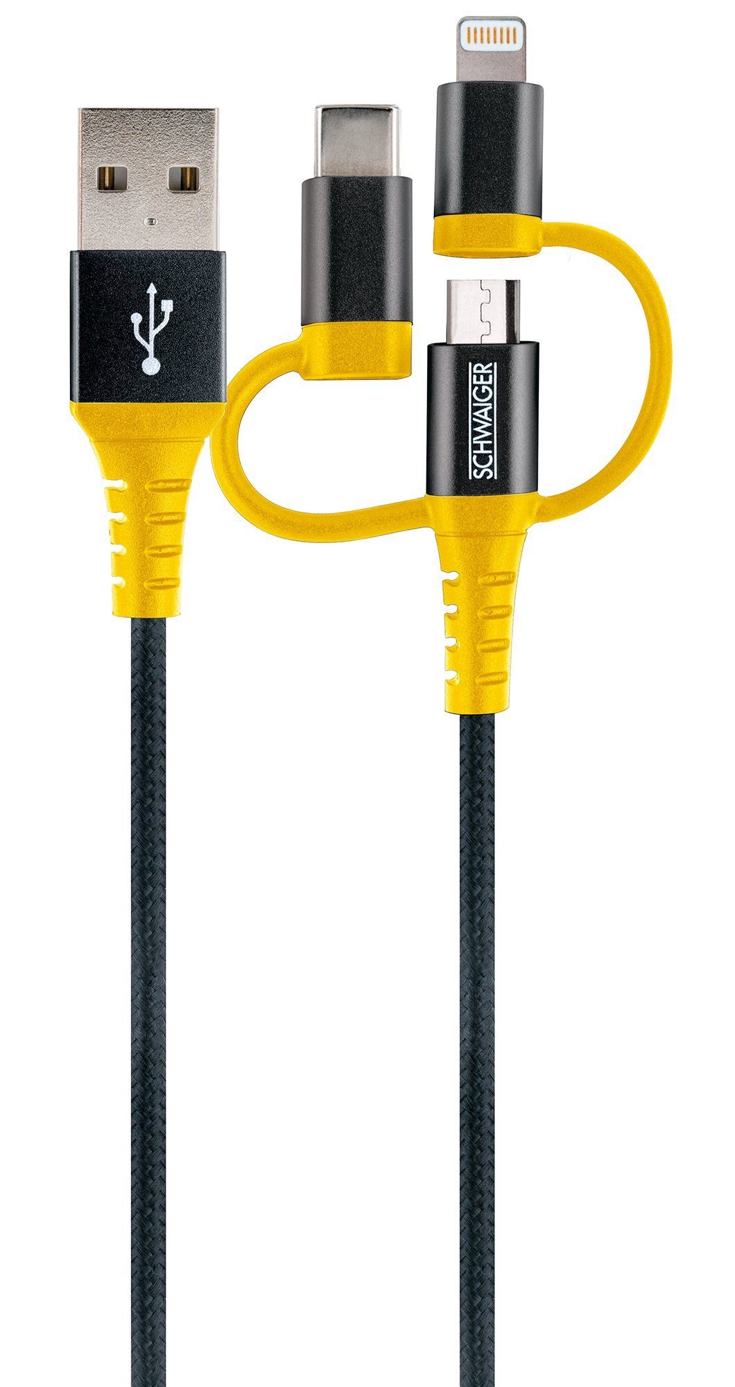 Dieses SCHWAIGER® 3-in-1 Sync & Ladekabel ist für die Verwendung mit einem Smartphone, Tablet, Laptop oder einer Festplatte konzipiert. Durch die 3 Steckertypen ist dieses Ladekabel der ideale Begleiter im Alltag oder auf Reisen für Ihre verschiedensten Geräte. Ein weiteres Highlight des Kabels ist der extrem reißfeste Aufbau.