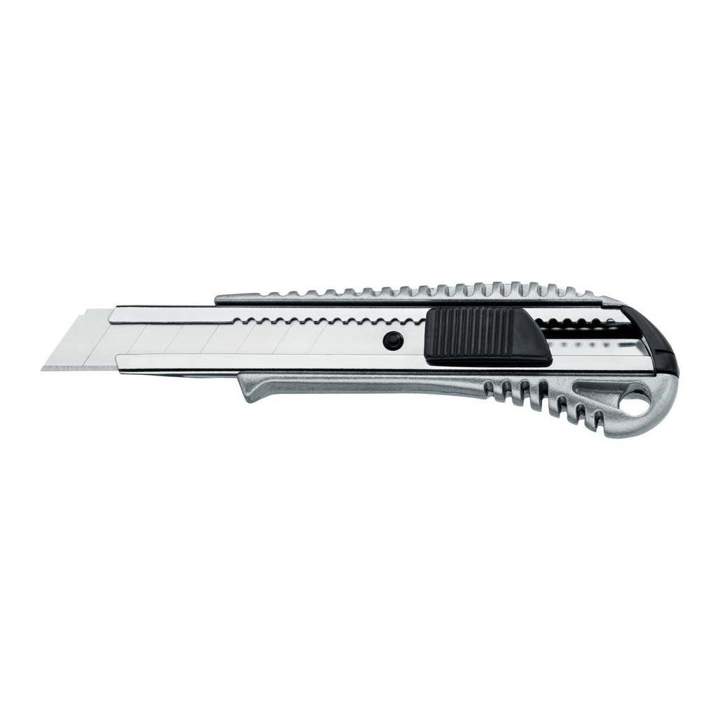Profi Cuttermesser mit hochwertigem Alu Druckguss Körper. Klingenführung im Cuttermesser aus Metall für sicheres Отмена der Klinge, automatische Arretierung. Für 18 mm Abbrechklingen.