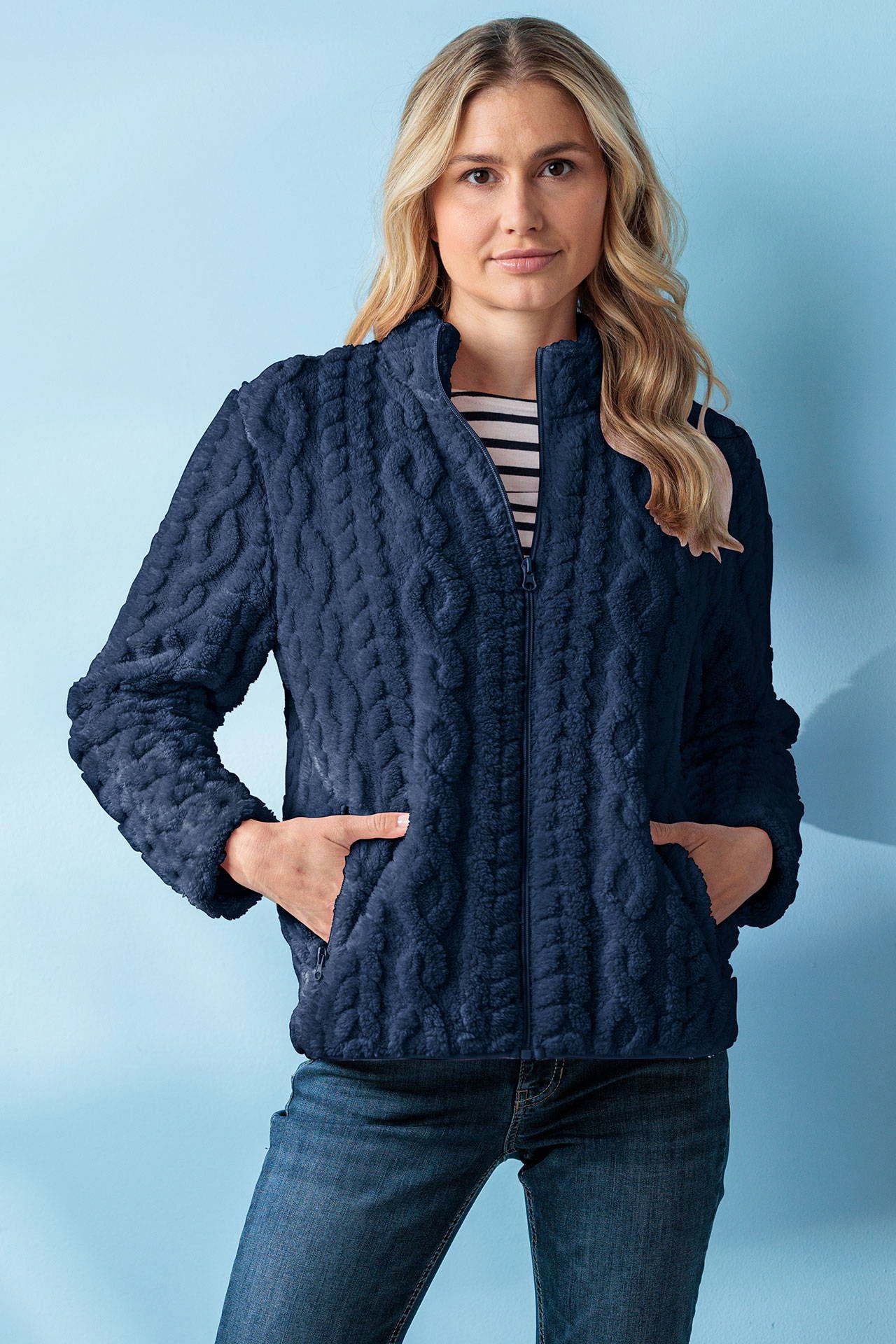 Die Kuschel-Fleecejacke vereint Funktionalität mit einem ansprechenden Design. Das Zopfmuster verleiht der Jacke eine modische Note, während die elastischen Bündchen und der Stehkragen für einen bequemen Sitz sorgen. Ideal für entspannte Tage oder als zusätzliche Schicht an kühleren Abenden.
