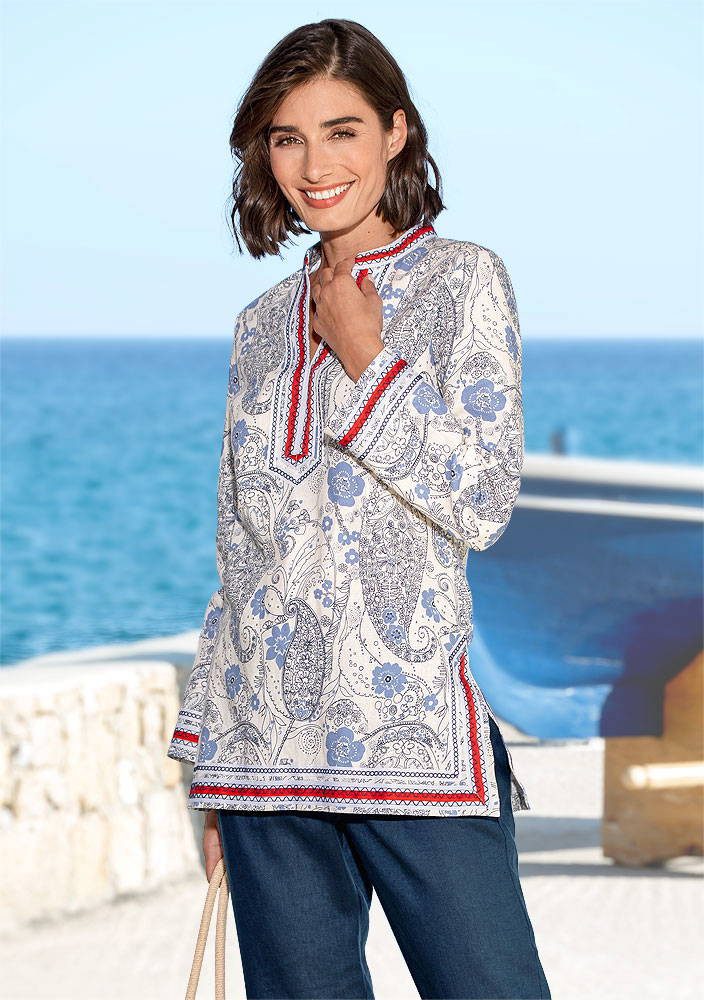 Die Druck-Leinentunika vereint stilvolles Design mit funktionalen Details und ist die perfekte Wahl für modebewusste Damen, die Wert auf Qualität und Ästhetik legen.