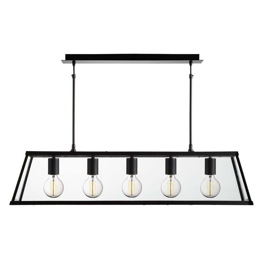 Diese mattschwarze Voyager 5flammige Laternenstableuchte mit klaren Glasscheiben hat einen einfachen, klassischen Look. Der mattschwarze, schräge Schirm hat vier Klarglasscheiben und verfügt über fünf Leuchten, die gleichmäßig entlang der Armatur positioniert sind und eine attraktive Lichtquelle für jeden Raum bieten. Die Leiste hängt mit einer verstellbaren Drahtaufhängung von der Decke und eignet sich perfekt für die Beleuchtung von Küchen und Essbereichen.