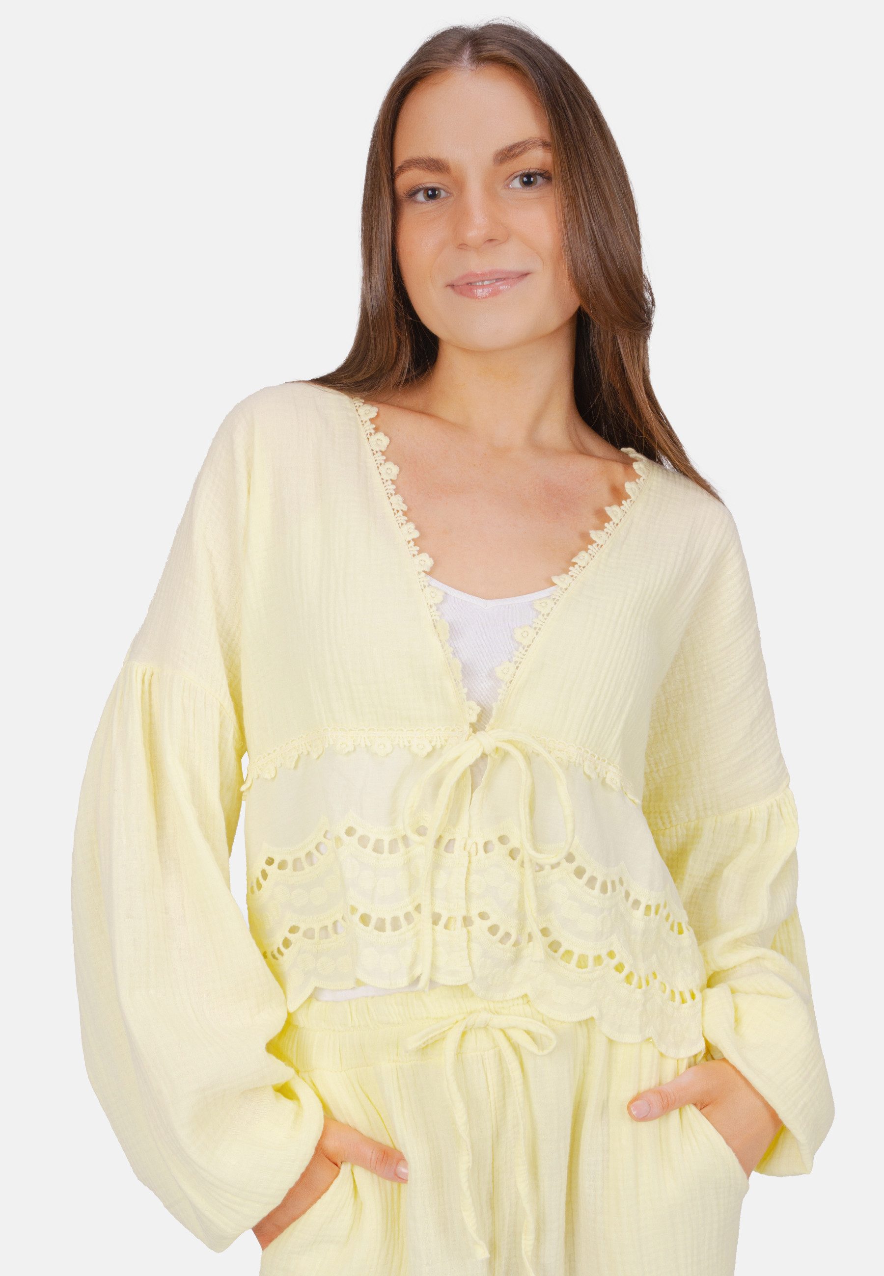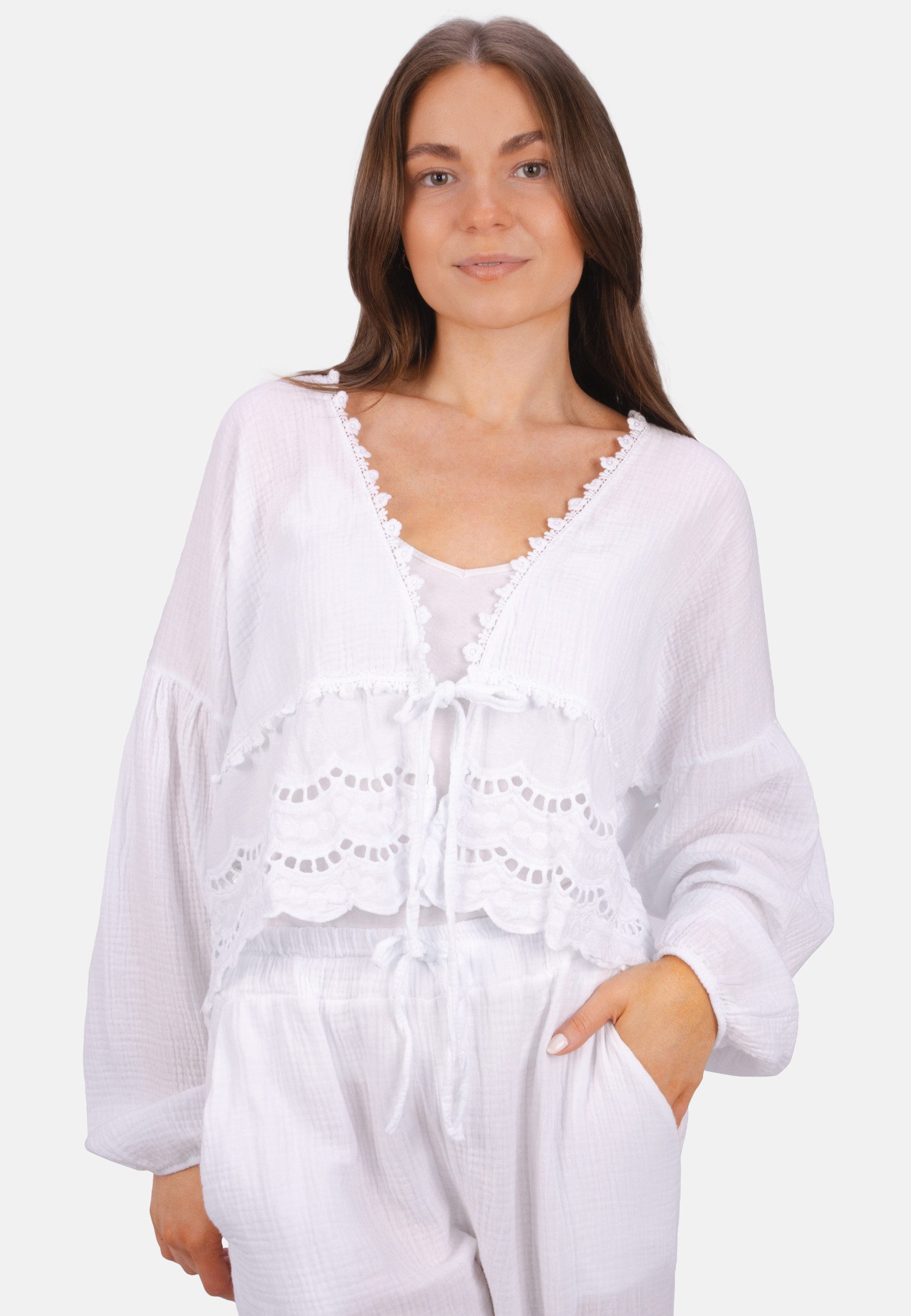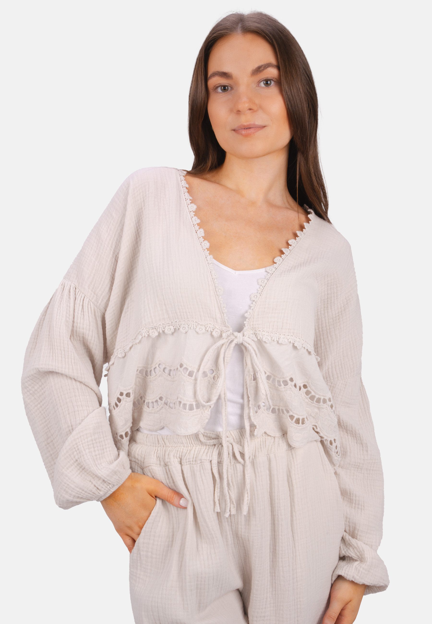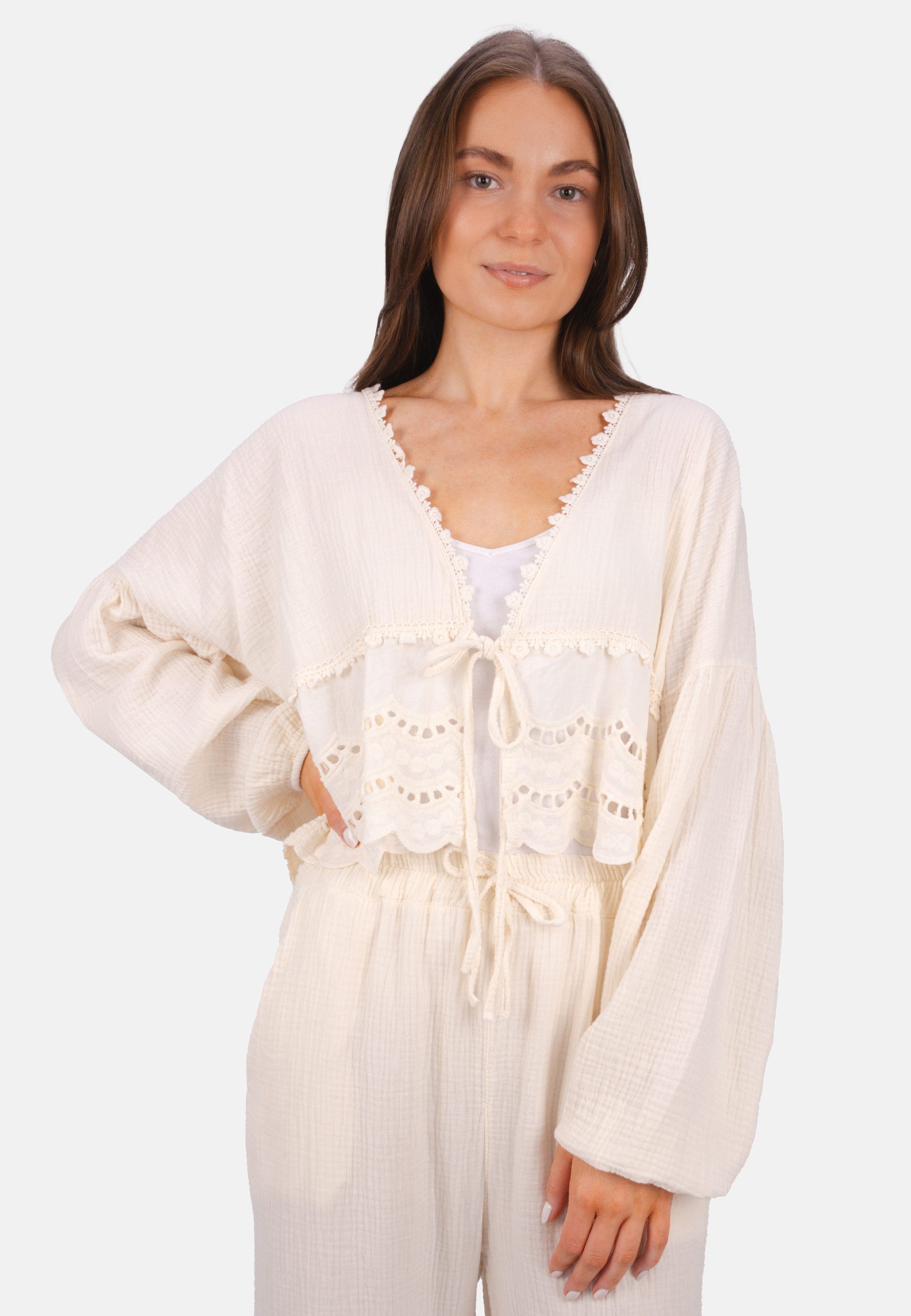Besondere Merkmale | Musselin Bluse mit Spitze & Bindeband – im Boho Stil Frühling/Sommer |