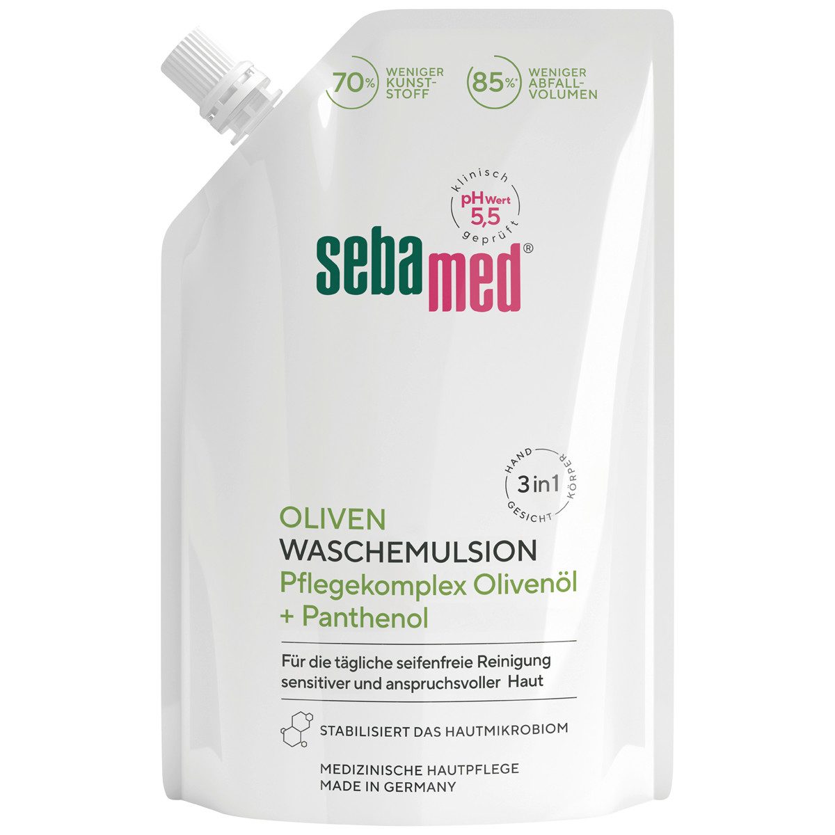 Die Sebamed seifenfreie Wasch-Emulsion mit Olive im praktischen 400 ml Nachfüllbeutel ist ideal für die schonende tägliche Reinigung empfindlicher und trockener Haut. Die Formel ohne Seife bewahrt den natürlichen Schutzmantel der Haut mit einem hautneutralen pH-Wert von 5,5. Hochwertiges Olivenöl spendet intensive Feuchtigkeit, beruhigt die Haut und schützt sie vor dem Austrocknen.