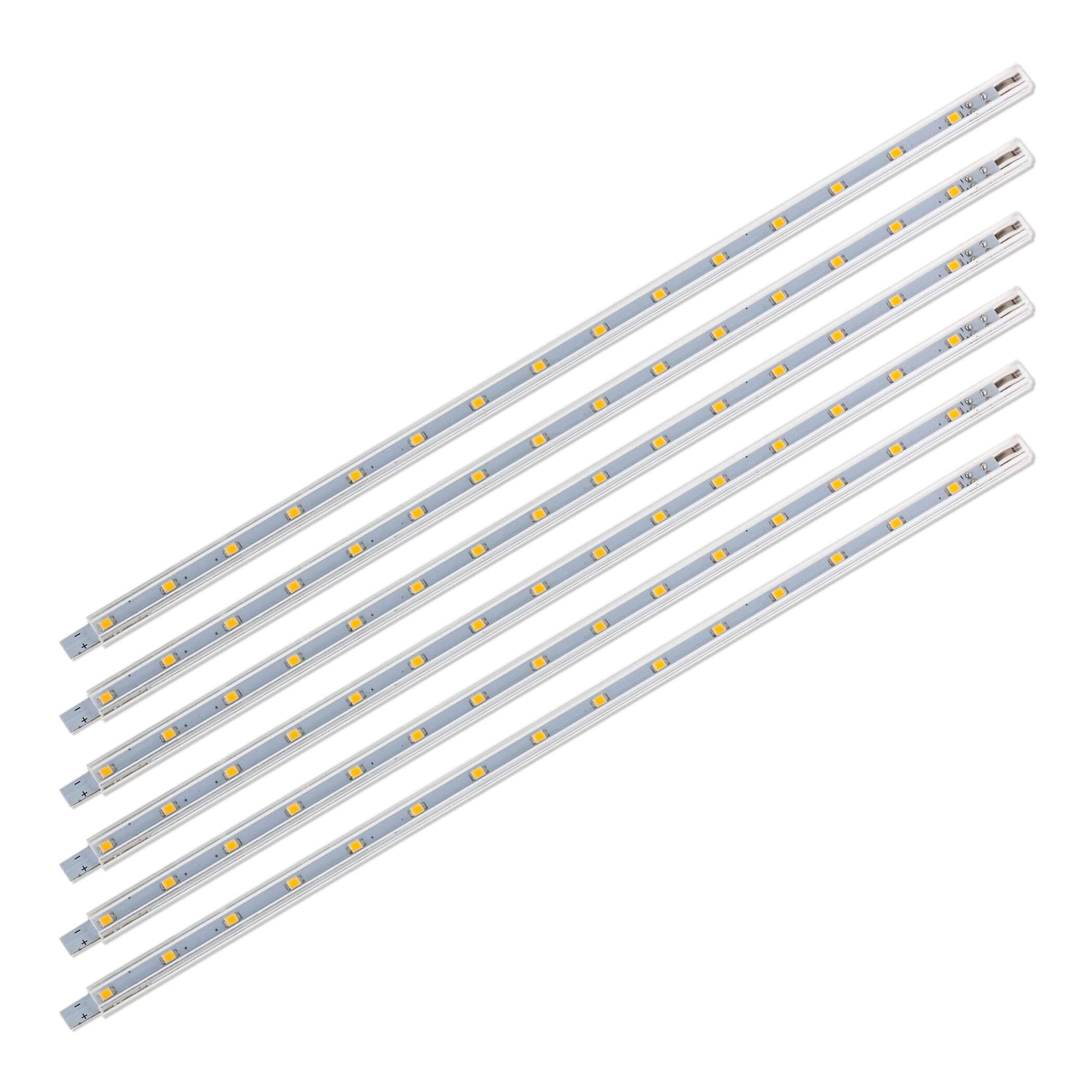 Dieses LED Unterbauleuchten Set eignet sich zur Beleuchtung von Glasvitrinen, Regalen oder Nischen in Möbeln. Die einzelnen LED Lichtleisten können direkt aneinander gekoppelt werden zu einer Gesamtlänge von 180cm. Oder man verwendet zur Überbrückung größerer Abstände die mitgelieferten Verbindungskabel. Damit können die LED Lichtleisten auch über mehrere Etagen eines Regales oder über Eck montiert werden.