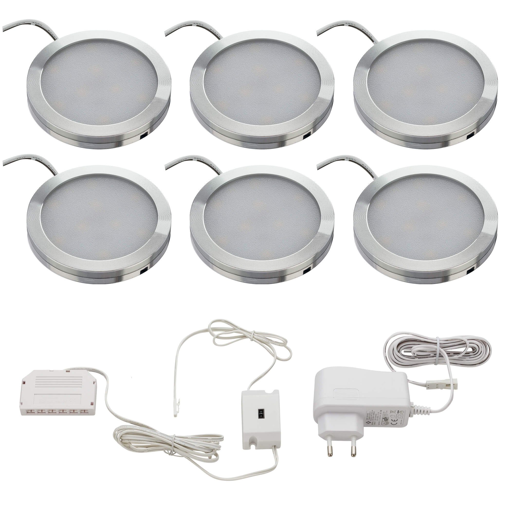 Sehr flache, runde Unterbauleuchten für die schnelle Montage, wahlweise mit Klebestreifen oder Schrauben, die sich im Lieferumfang befinden. Die sechs Unterbauleuchten werden durch einen berührungslosen Schalter (mit Infrarot Sensor) ein- und ausgeschaltet. Eine kurze Handbewegung über dem Sensor, bei einer Entfernung von 6-8cm zum Sensor, schaltet die Schrankleuchten ein und aus. Bleibt die Hand länger über dem Sensor, dann schaltet die Dimmfunktion ein.