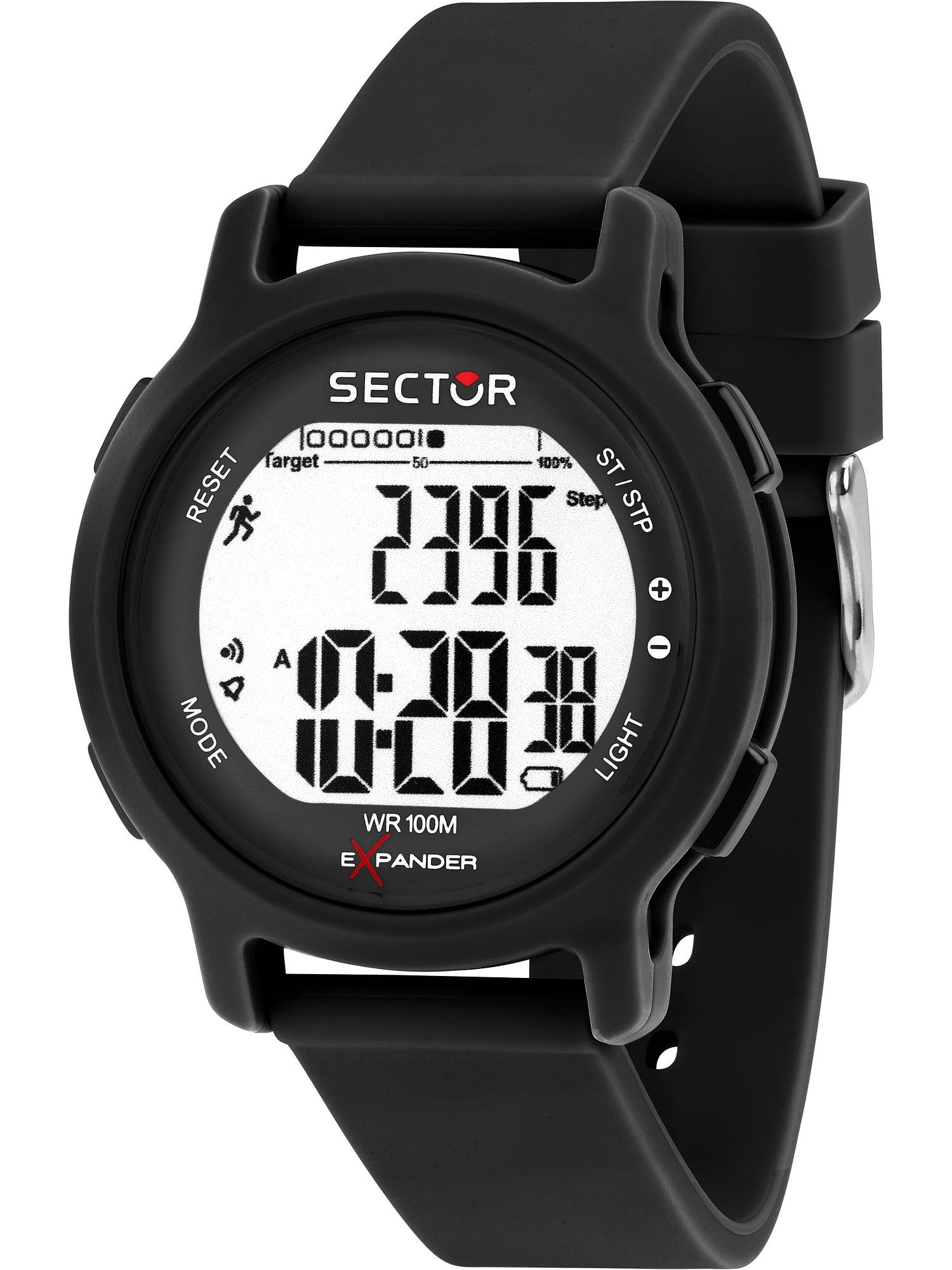 Dynamische Optik und ausgefeilte Technologien machen die Sportuhren von Sector aus. Die italienische Marke mit langer Uhrentradition vereint in der aktuellsten Generation der digitalen Zeitmesser funktionales, robustes Design und langlebige, hochwertige Technik und kreiert so Begleiter für jeden Tag. Ein Accessoire, das deinen Look perfektioniert Diese digitale Herrenuhr von Sector begeistert mit ihren vielfältigen Funktionen ebenso wie mit ihrem gefälligen Design. Die runde Form des Gehäuses der Ex-27 ergänzt den schicken Look in Bicolor ideal und kreiert ein stimmiges Design. Mit seinem stilvollen Blau garantiert das digitale Ziffernblatt eine klare Ablesbarkeit der Uhrzeit. Das flexible Plexiglas überzeugt nicht nur durch Leichtigkeit und Schlagfestigkeit, sondern verhindert auch unerwünschte Spiegelungen. Dieser Zeitmesser ist wirklich immer und überall der ideale Begleiter: Dank einer Wasserdichte von 10 Bar kann er selbst beim Schwimmen unbesorgt am Handgelenk verbleiben. Das Kunststoffarmband in Blau verleiht dem Zeitmesser einen modernen Look mit durchdachtem Design. Die Dornschließe bietet angenehmen Tragekomfort, erleichtert das Anlegen und sorgt für einen verlässlichen Verschluss. Zusammenfassend lässt sich festhalten, dass die Ex-27 dank technischer Präzision, kunstvollem Design und einem hervorragenden Preis-Leistungsverhältnis nicht nur ein zuverlässiger Begleiter bei sportlichen Aktivitäten ist, sondern auch als echter Hingucker im Alltag überzeugt.