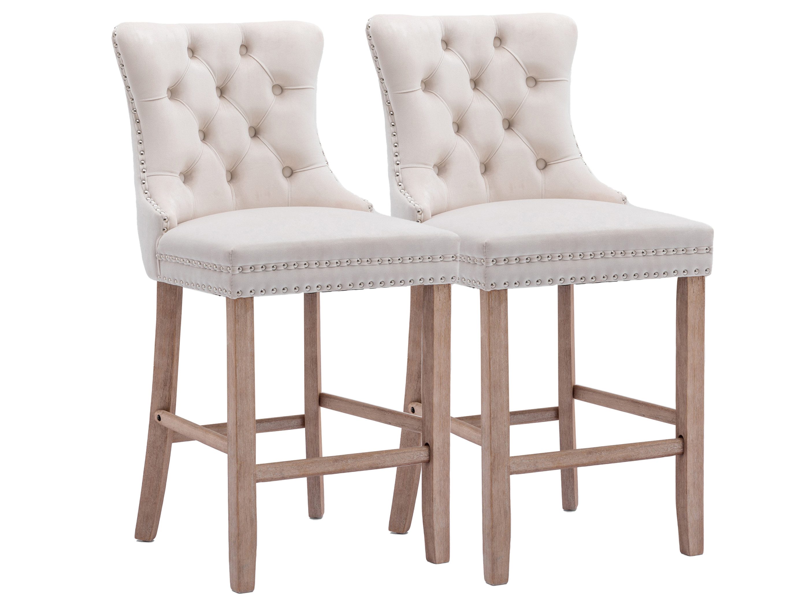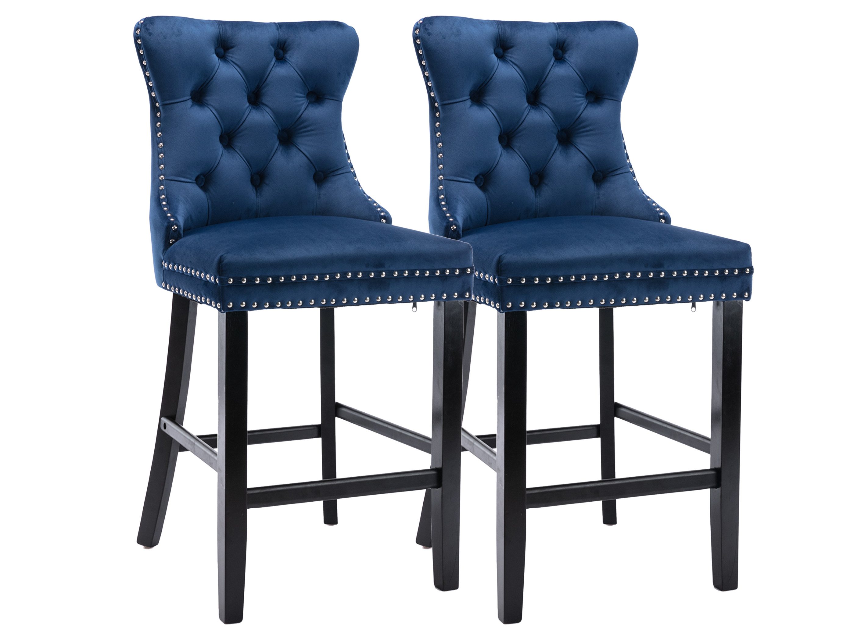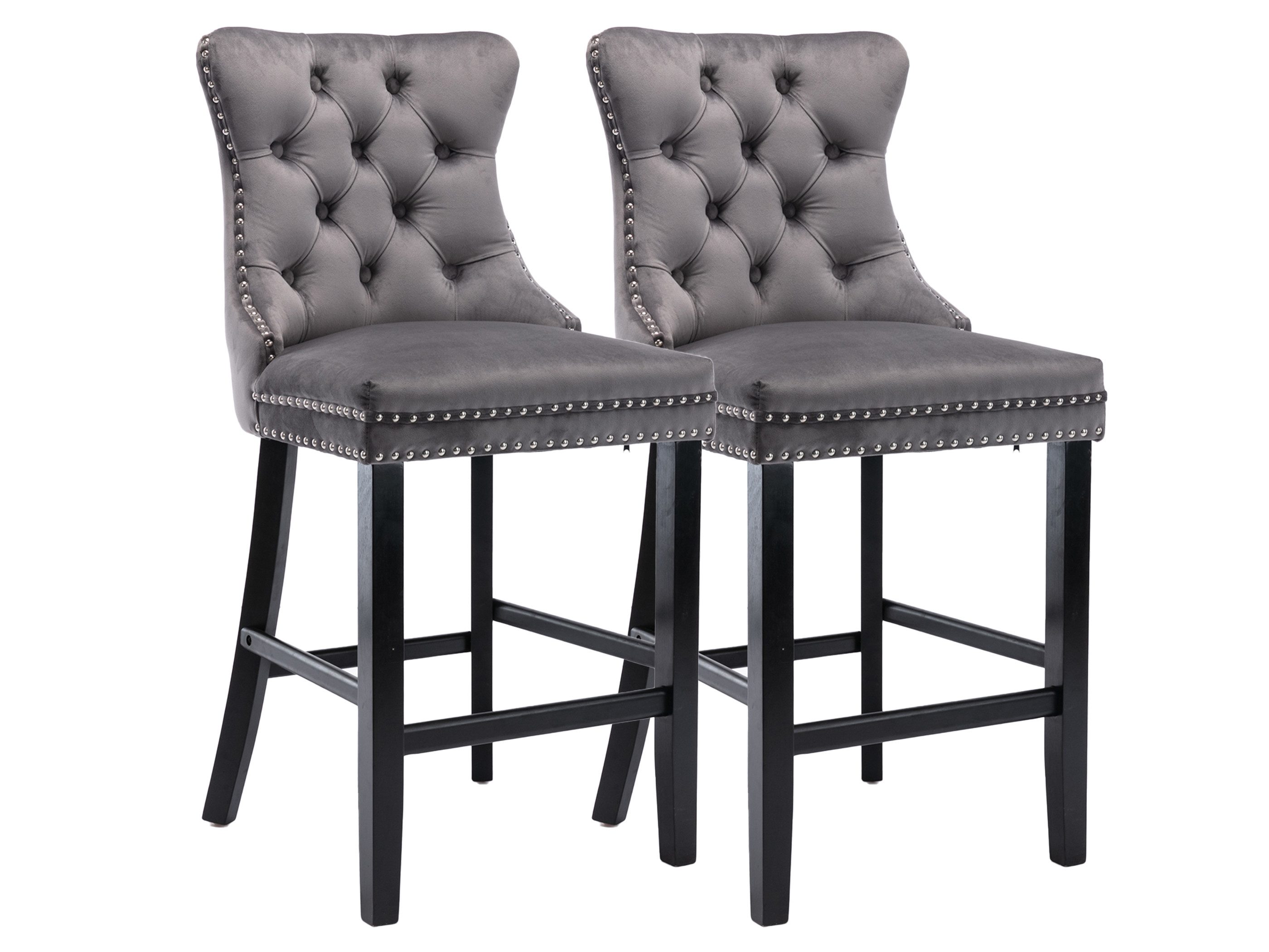 Diese eleganten Barhocker im 2er Set verbinden stilvolles Design mit hohem Komfort. Der edle Samtbezug und die weich gepolsterte Sitzfläche mit hochdichtem Schaumstoff und Stahl-Federkern sorgen für ein angenehmes Sitzerlebnis. Umlaufende Nieten sowie die geschwungene, hohe Rückenlehne mit klassischem Knopf-Design unterstreichen die luxuriöse Optik, während der silberne Ring auf der Rückseite sowohl als dekoratives Detail als auch praktischer Griff dient. Vier massive Holzfüße mit Querstreben bieten hohe Stabilität und dienen gleichzeitig als Fußstütze, wobei die verstellbaren Schrauben für sicheren Stand auf unterschiedlichen Böden sorgen. Dank der einfachen Montage sind die Hocker schnell aufgebaut und sofort einsatzbereit – ideal für Küche, Bar oder Wohnbereich.