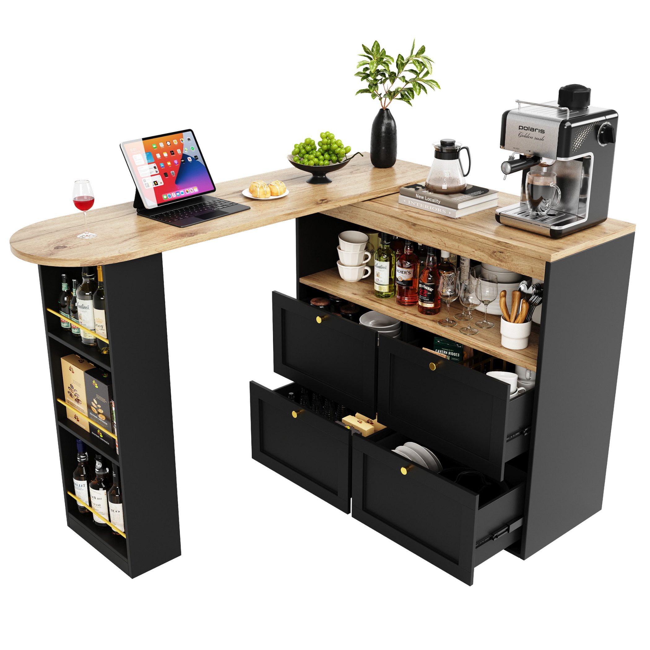 Diese Bartisch kombiniert schwarze und Holzmaserungsoberflächen mit goldenen Griffen, was einen modernen und eleganten Look schafft und einen Hauch von Luxus hinzufügt. Das durchdachte Design mit einer 360°-Drehung ermöglicht eine flexible Anordnung, der Seitenschrank kann in eine L-Form gedreht oder zu einem kompakten Servierbereich zusammengeklappt werden. Sie ist mit 4 Aufbewahrungsschubladen und 4 offenen Fächern ausgestattet, die vielfältige Aufbewahrungsbedürfnisse erfüllen. Die offenen Fächer haben die passende Höhe für Flaschen und sind mit einem Metallstangengitter ausgestattet, das die Flaschen sicher und stabil hält. Die Tischplatte eignet sich zum Kochen, Essen oder als Ausstellungsfläche und trägt zur Schaffung von Raumtiefe bei. Das vollflächige Design sorgt für ausgezeichnete Stabilität, mit einer Tragfähigkeit von bis zu 60 kg.