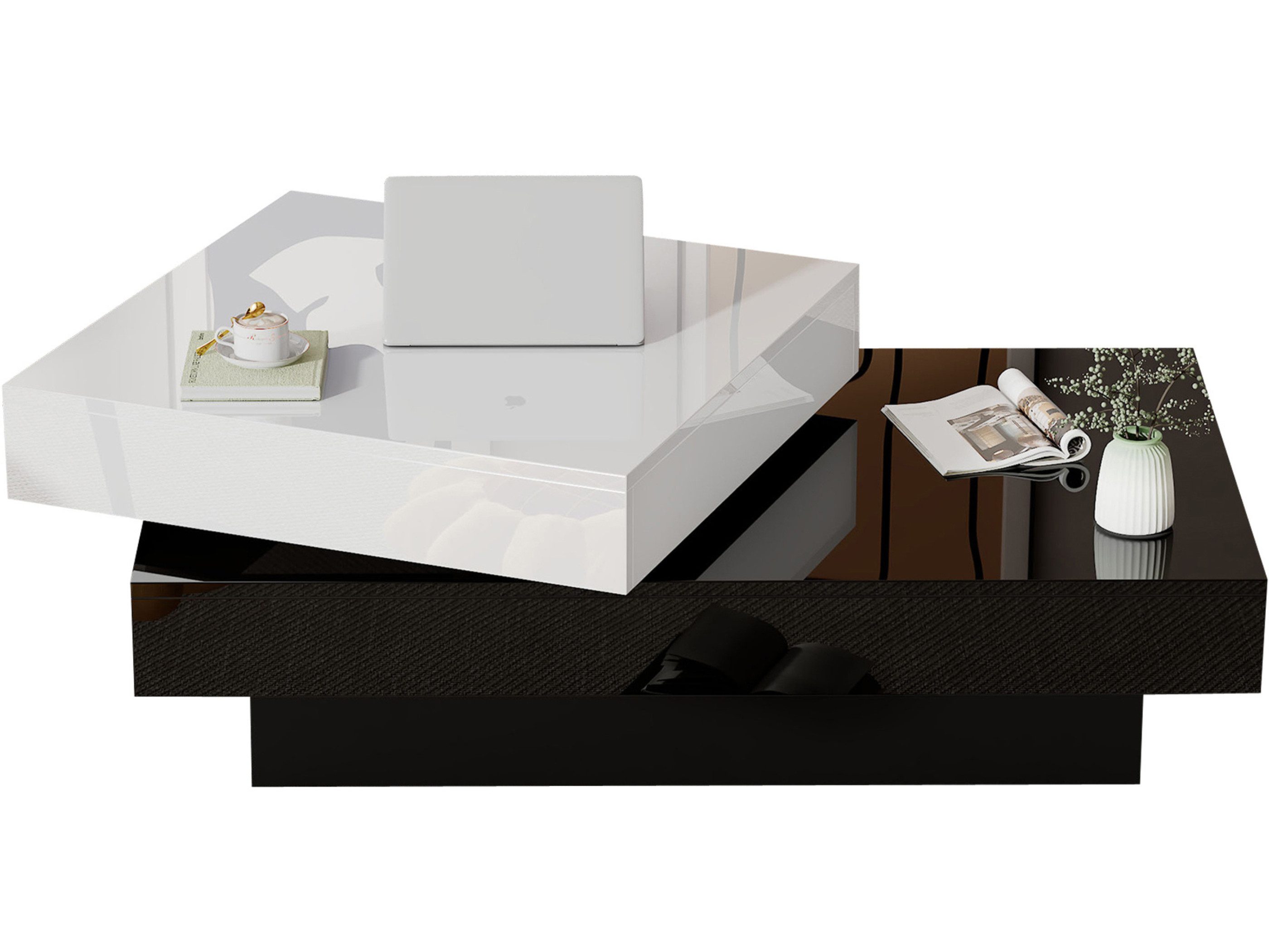 Dieser doppelstöckige Couchtisch bringt modernes Design und praktische Funktion in Einklang. Die obere quadratische Tischplatte ist um 360 Grad drehbar und lässt sich flexibel an verschiedene Bedürfnisse im Alltag anpassen – ideal zum Servieren, Dekorieren oder Umstellen nach Wunsch. Beide Ebenen sind mit einer eleganten Hochglanz-Oberfläche versehen, die nicht nur optisch überzeugt, sondern auch pflegeleicht ist. Eine transparente Schutzfolie bewahrt die Flächen zusätzlich vor Kratzern und Abnutzung. Mit zwei Ablageflächen bietet der Tisch ausreichend Stauraum für Bücher, Fernbedienungen oder Dekoartikel. Die durchgehende Bodenauflage sorgt für hohe Stabilität und verleiht dem Couchtisch einen soliden Stand. Perfekt geeignet für moderne Wohnräume, in denen Design und Funktionalität gefragt sind.