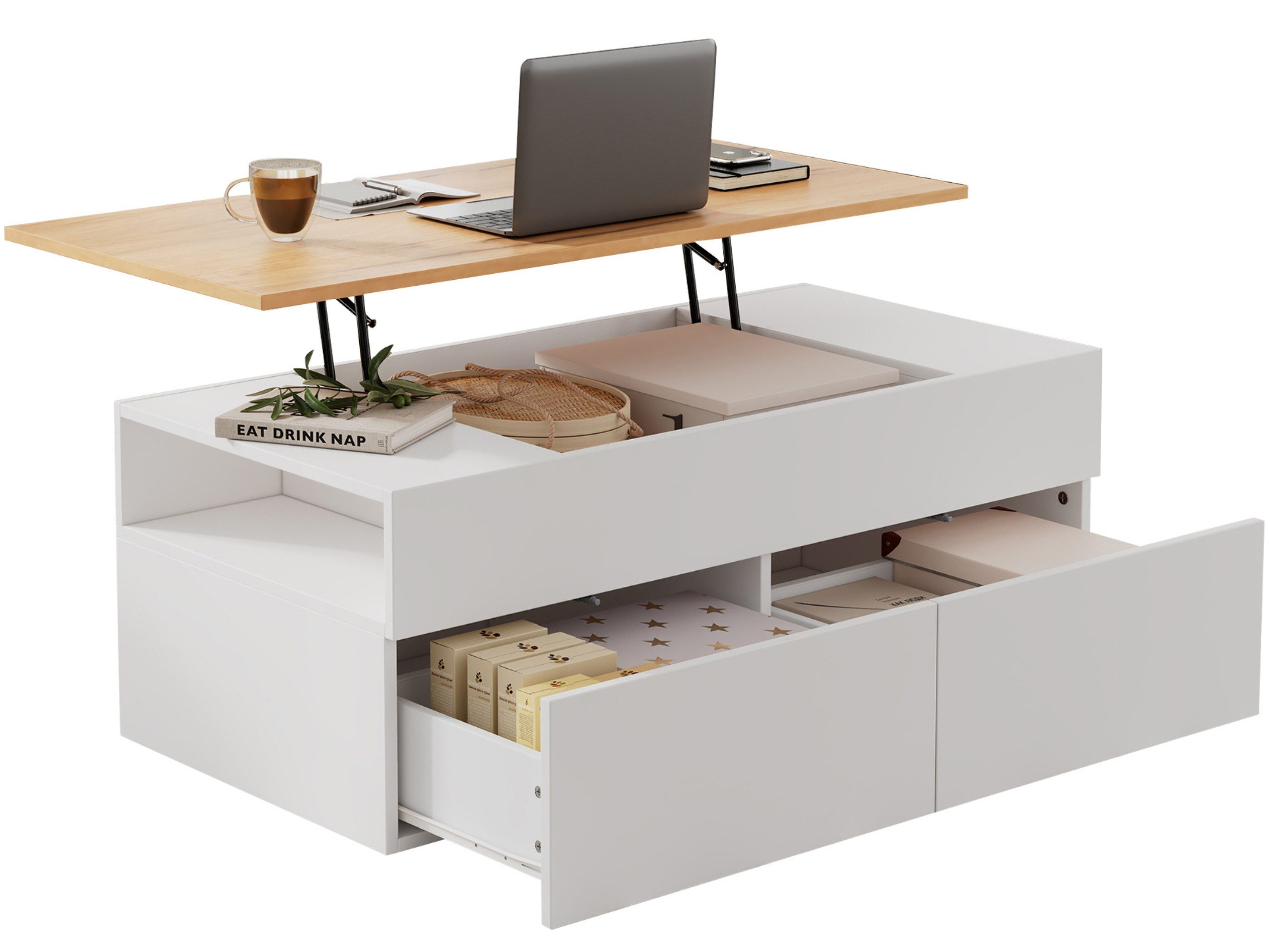 Dieser moderne Couchtisch verbindet zeitloses Design mit praktischen Funktionen. Die Tischplatte in stilvoller Holzoptik lässt sich durch eine Hebestange einfach anheben, um einen versteckten Aufbewahrungskasten freizugeben. Zusätzlich entstehen bei angehobener Platte zwei weitere Ablageflächen, die für Snacks, Getränke oder Arbeitsmaterial genutzt werden können. Je ein offenes Fach auf beiden Seiten bietet Platz für dekorative Elemente oder schnell griffbereite Gegenstände, während zwei grifflose Schubladen mit Rückprallmechanismus diskreten Stauraum schaffen. Die niedrigen, stabilen Stützbeine sorgen für einen sicheren Stand und runden das moderne Erscheinungsbild perfekt ab – ideal für ein aufgeräumtes und stilvolles Wohnzimmer.