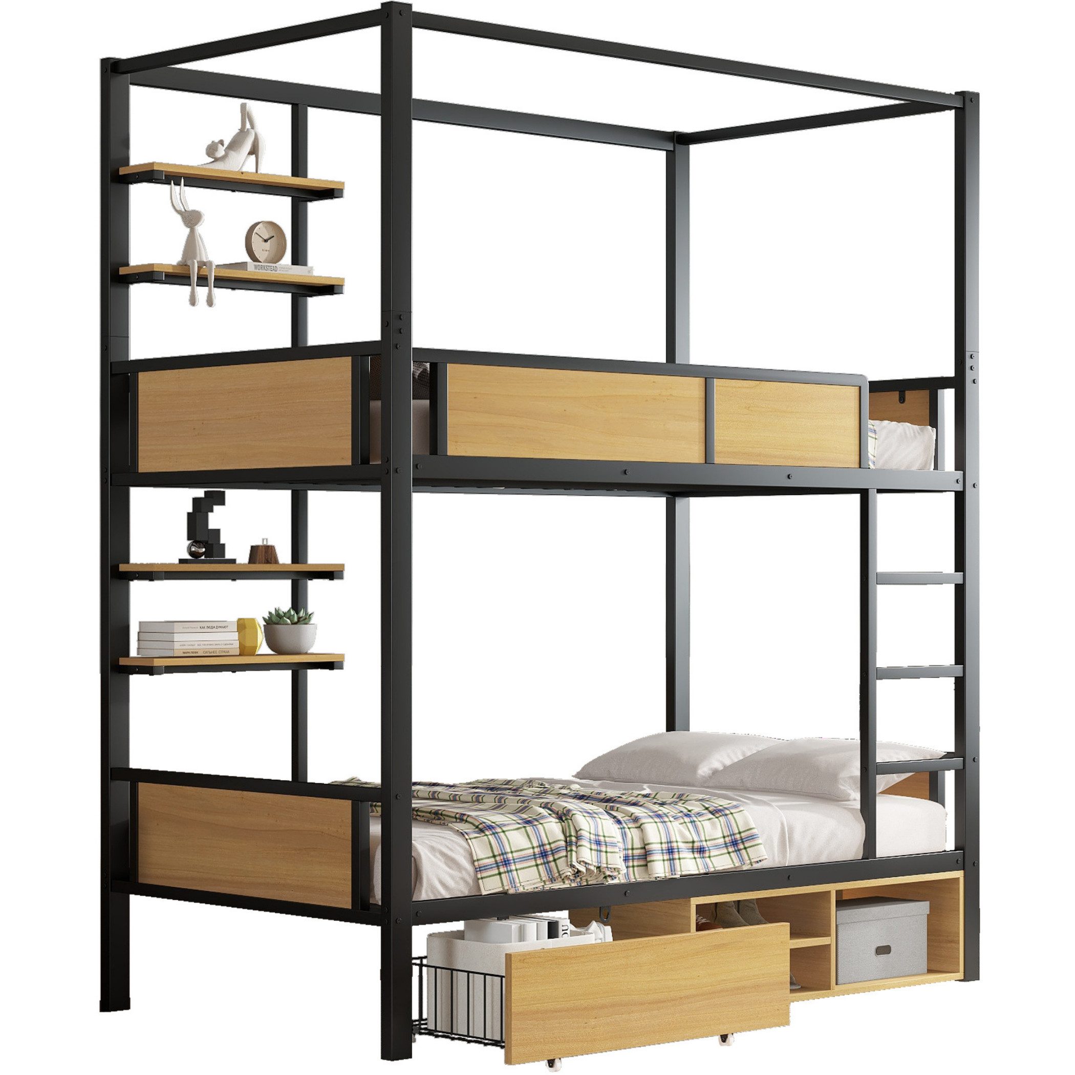 Dieses Etagenbett vereint modernes Design mit praktischer Funktionalität und bietet zwei komfortable Schlafplätze – perfekt für Familien oder Gästezimmer. Der pulverbeschichtete Eisenrahmen in Schwarz sorgt nicht nur für Stabilität, sondern verleiht dem Bett auch einen modernen Industrie-Look. Die obere Etage ist als stilvolles Himmelbett mit Rundumschutz gestaltet und bietet mit zwei hängenden Regalen zusätzlichen Komfort. Auch die untere Liegefläche verfügt über zwei Regale, um alltägliche Dinge griffbereit zu halten. Die geradlinige 3-stufige Leiter erleichtert den Aufstieg nach oben. Ergänzt wird das Möbelstück durch eine geräumige Rollschublade mit Eisenrahmen sowie drei offene Fächer, die vielfältige Stauraumlösungen ermöglichen. Ein durchdachtes Design, das nicht nur gut aussieht, sondern auch funktional überzeugt.